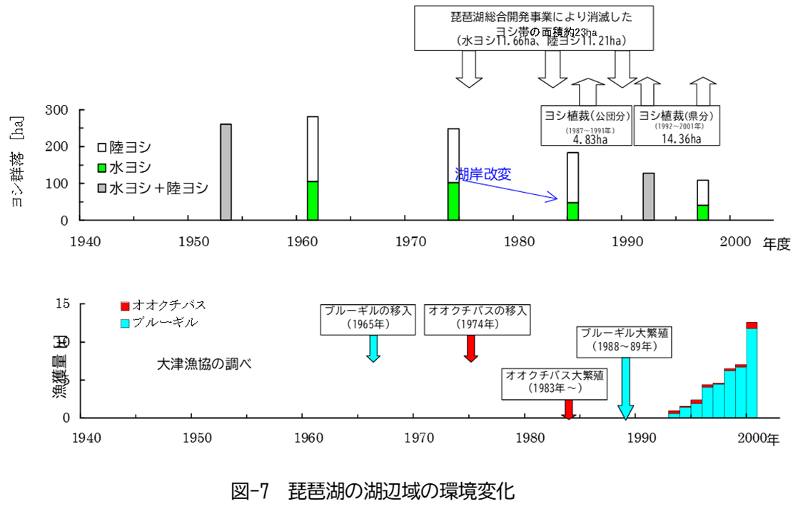 ヨシ帯が減少し、コイやフナなどが産卵できず、稚魚の避難場所も失われました。生活排水の増加が主因ですが、ヨシ帯の減少によって本来の浄化機能も弱まり、水質悪化の一因となりました。