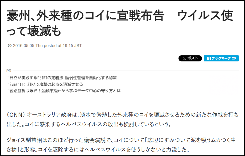 オーストラリアでは大きな影響を及ぼしており、鯉に宣戦布告をしています。