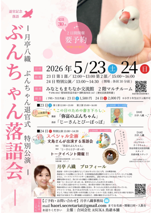 認定NPO法人TSUBASAの松本壯志さんにもまたお会いできました。鳥爺本舗として出店されていました。そして、月亭八織さんという、月亭八方師匠のお弟子さんがご参加されていました。今度、文鳥をテーマにした落語会を開くそうですよ。とっても気さくな方でした。
