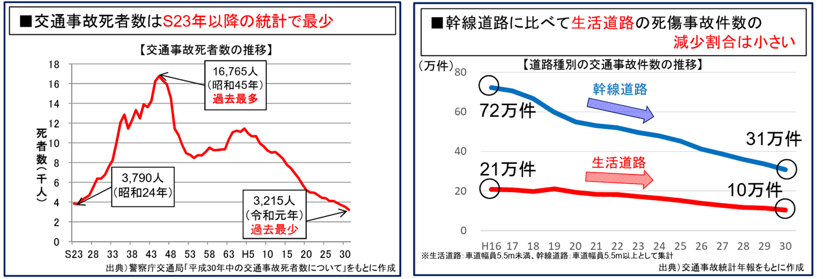 マスメディアによって、あたかも安全ではないかのような印象を受けますが、車の頑丈さ向上、自動ブレーキなどのシステム面の進化も貢献しています。一方、生活道路での事故件数の減り具合が少ないと資料では指摘しています。
