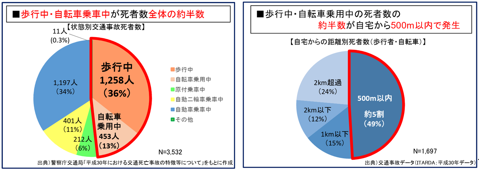 歩行者と自転車を合わせて50%が死者数となっており、家から500mと近い場所で事故が起こっているとのことです。