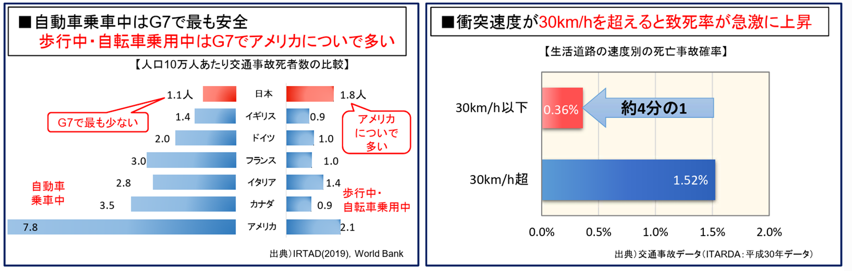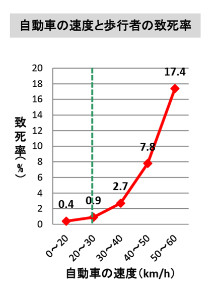 そして時速30kmを越えると致死率が上がるというデータがあります。これをベースに制限30キロという発想に至ったと思われます。