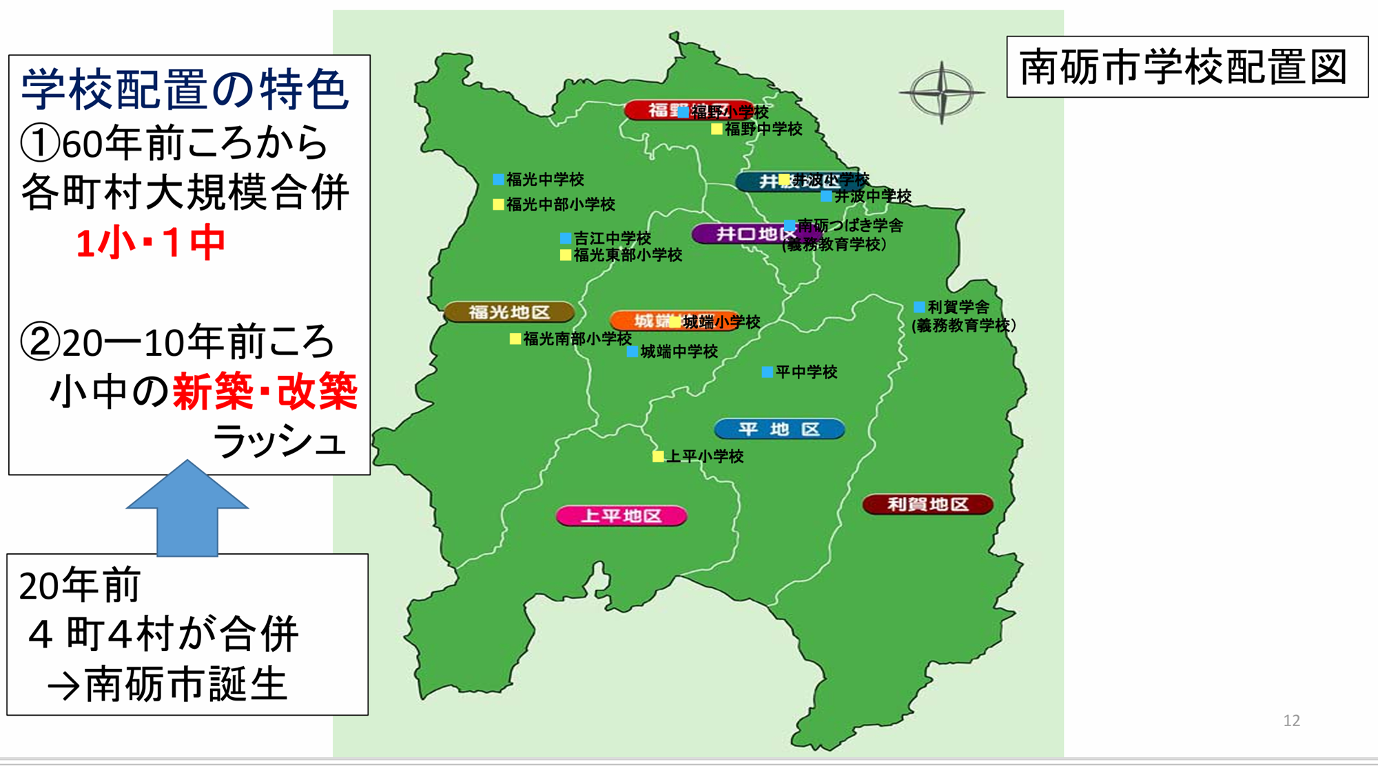 南砺市は、8つの町村が合併して誕生した市です。そのため、小学校が9カ所、中学校が8カ所ありました。