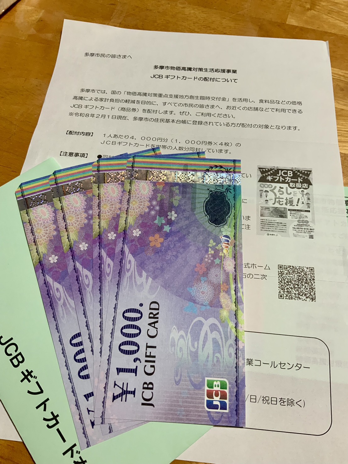 多摩市の物価高対策として配付されているJCBギフトカード(1人あたり4,000円分)。既に配布が始まっており、私のところにも届きました。