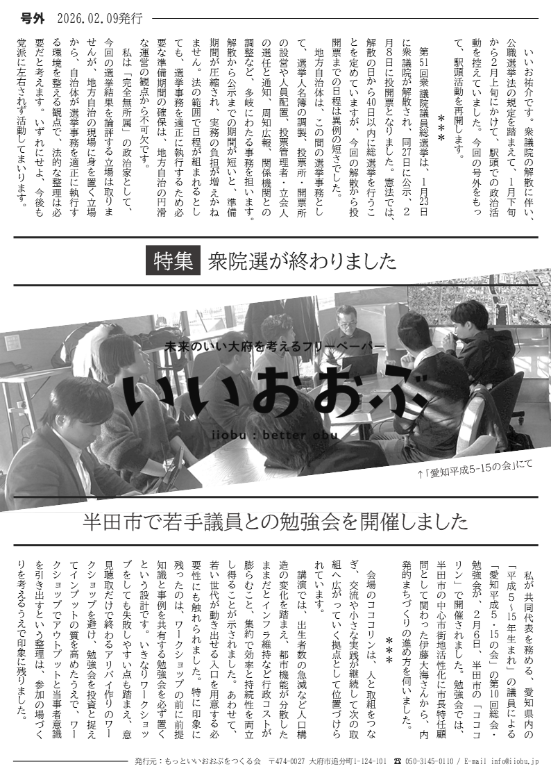 本記事では、朝の駅頭活動で配布している活動報告「いいおおぶ」の号外(2026年2月9日発行)を掲載します。