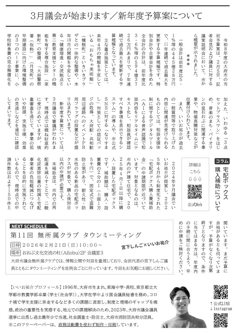 ホーム>政党・政治家>いいお 祐介 (イイオ ユウスケ)>大府市の令和8年度当初予算案の概要|宅配ボックス補助|いいおおぶ号外|いいお祐介|2026年2月9日