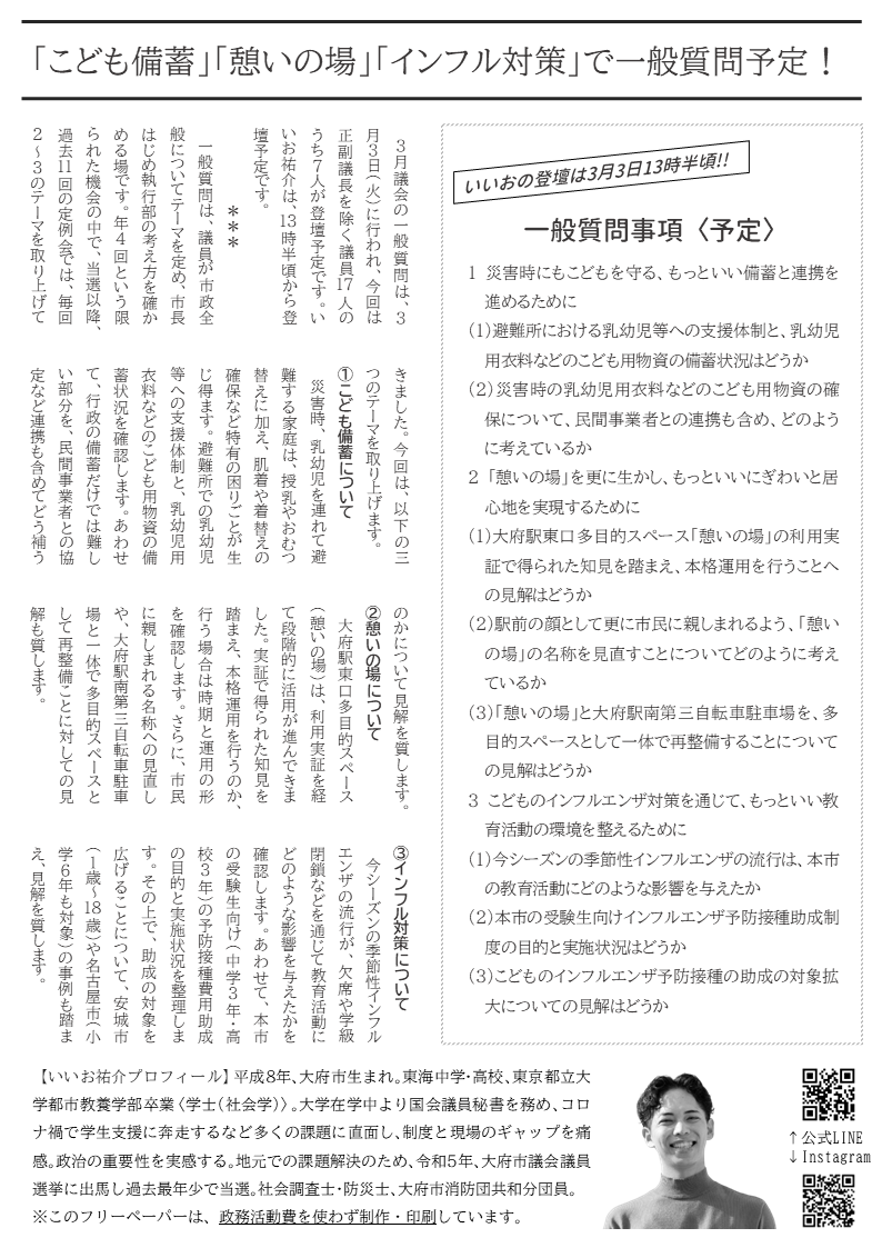ホーム>政党・政治家>いいお 祐介 (イイオ ユウスケ)>大府市3月議会開会|高校生年代通院無償化と一般質問|いいおおぶ号外|いいお祐介