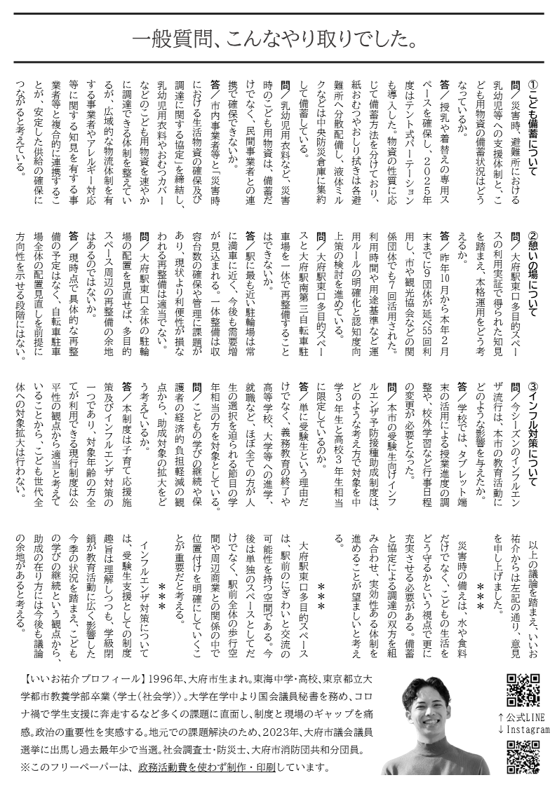 ホーム>政党・政治家>いいお 祐介 (イイオ ユウスケ)>大府市3月議会一般質問|こども用備蓄・憩いの場・インフル対策|号外|いいお祐介|2026年4月3日