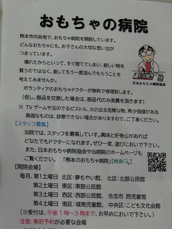 3月8日(日)くまもと新都心プラザで開催の「おもちゃ病院」に参りました。ボランティアグループ熊本のおもちゃ病院の皆さんが、おもちゃドクターとして活動されている様子を拝見しました。