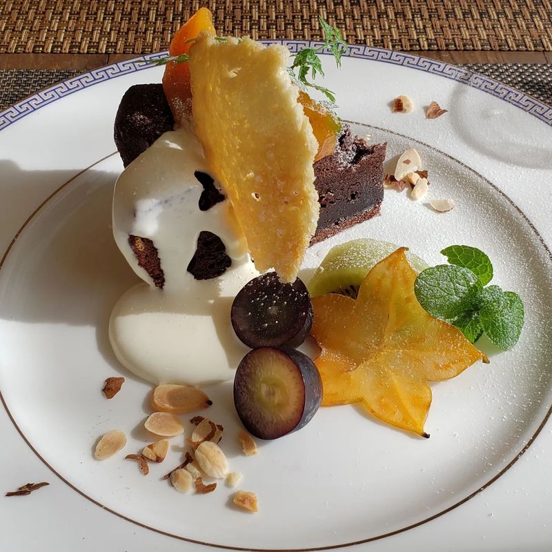 実家で採ったかきのコンポートを添えたビター風味のガトーショコラ