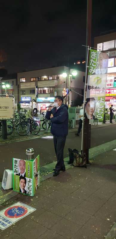 今晩は朝に引続き喜多見駅南口にて夜の御挨拶でしたが、スピーカー使ったスペシャルバージョン!