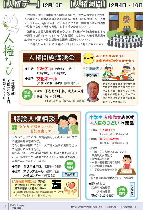 2025年12月号では、人権問題講演会の案内や地域猫活動などの内容が記載されております。
