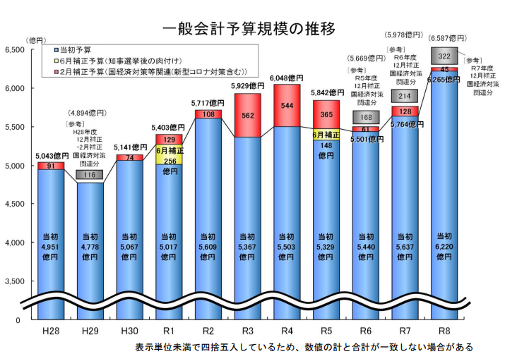 令和8年度一般会計予算案は約6220億円、令和7年度一般会計補正予算案は約45億円計上されております。