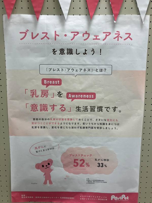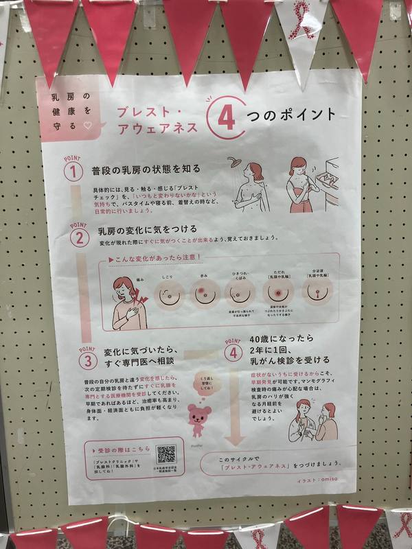 区役所五階のよく使うお手洗いには、ブレスト・アウェアネスについての啓発ステッカーが貼られており、今回自分で違和感をキャッチして病院に行ったのは、ステッカーのおかげで自然と刷り込まれていたからじゃないかな?と思っています。