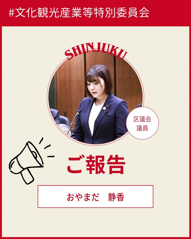 ホーム>政党・政治家>おやまだ 静香 (オヤマダ シズカ)>【文化観光産業等特別委員会のご報告】みなさまこんにちは😊新宿区議会議員のおやまだ静香です☺️本...