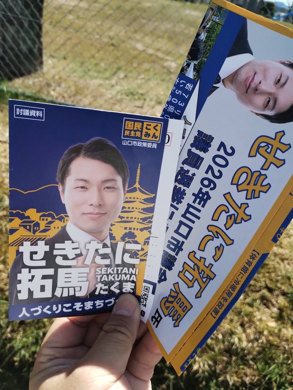 石田たくなり防府市議、ナカハラタカシ下関市政策委員の乗る街宣車を見送った後は、山口市内で #せきたに拓馬 後援会活動&ポスティング🚶 朝は肌寒かったのですが、日中は汗ばむ陽気💦