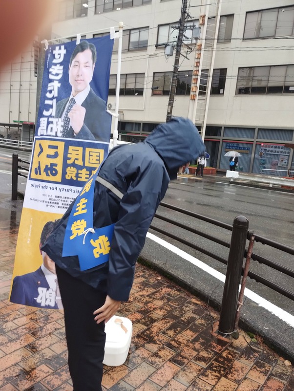 ホーム>政党・政治家>のだ きよし (ノダ キヨシ)>#せきたに拓馬山口市政策委員雨天の朝、山口市民会館前にてご挨拶👋石田たくなり防府市議も街宣車で...