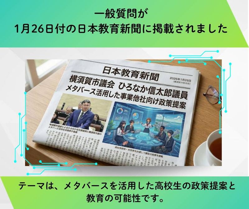 ホーム>政党・政治家>ひろなか 信太郎 (ヒロナカ シンタロウ)>【ご報告】私の一般質問が1月26日付の日本教育新聞に掲載されました。