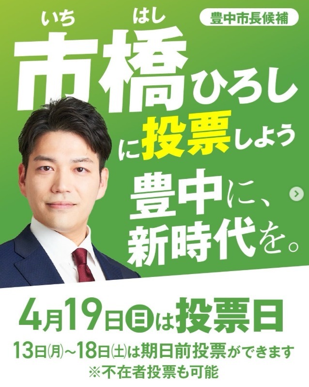 明日はいよいよ豊中市長選挙です! 日が変わるギリギリ(投開票日になってしまうとリポストも公選法違反になるので)に市橋候補のポストを引用させていただきました!