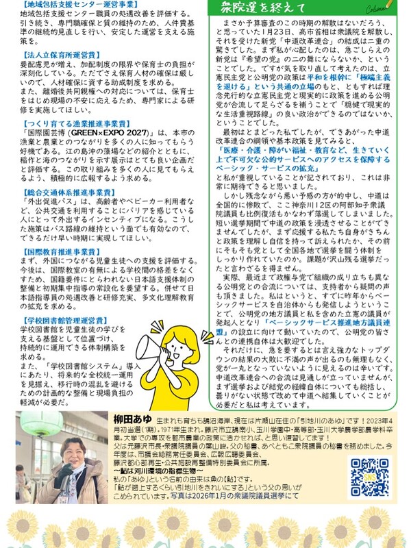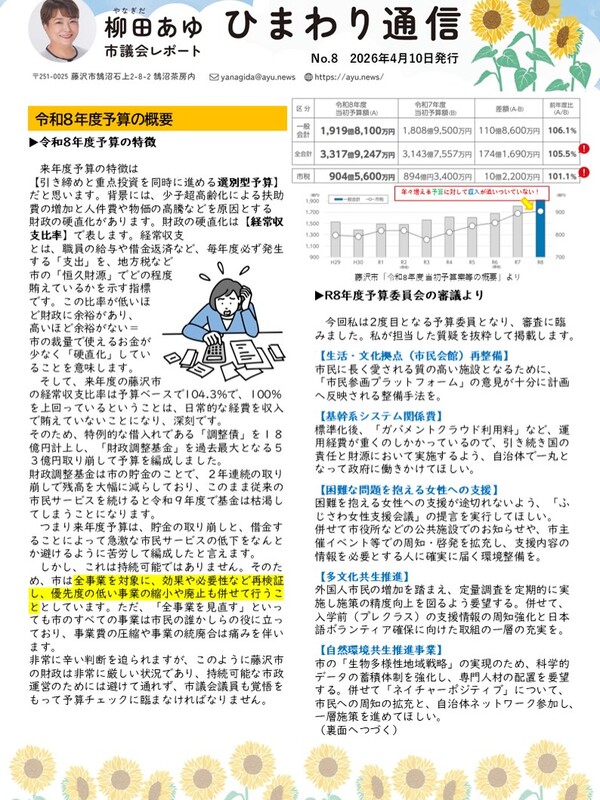 ホーム>政党・政治家>柳田 あゆ (ヤナギダ アユ)>更新が遅くなりましたが、議会レポート『ひまわり通信🌻No.8』が出来上がりました。