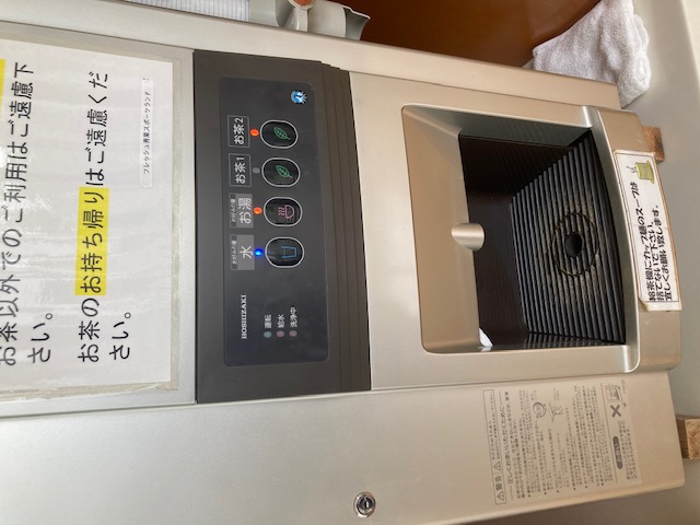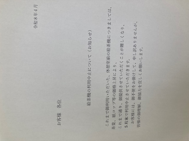 屋内プール近くの休憩所に行くと、給茶機が「5月末まで」という知らせにびっくりしました!!