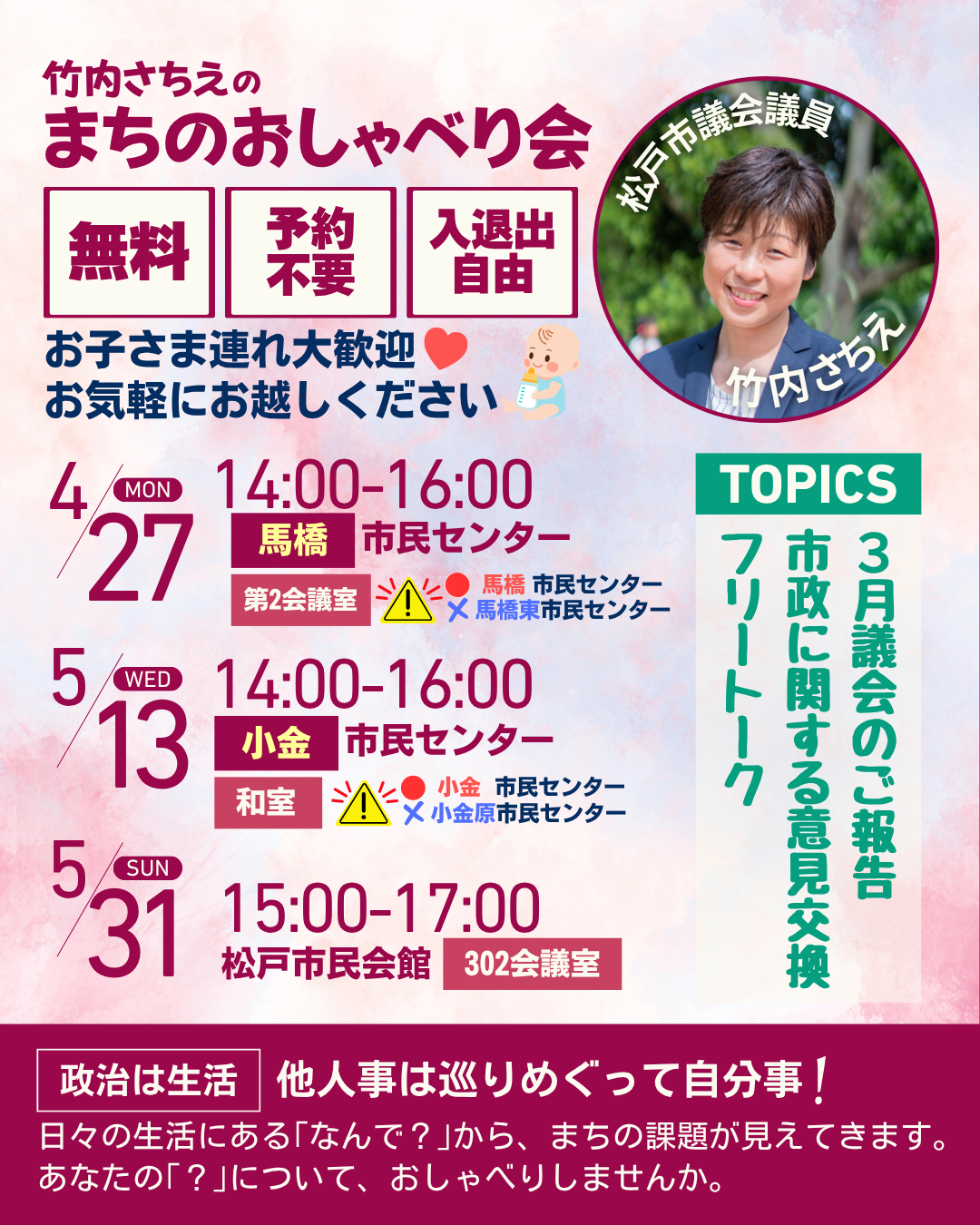 ホーム>政党・政治家>竹内 さちえ (タケウチ サチエ)>まちのおしゃべり会
