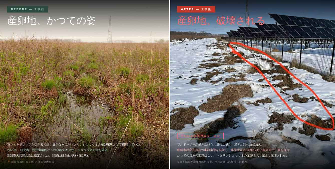 1枚目(BEFORE)は工事前の姿だ。ヨシとヤチボウズが広がる静かな湿原。そこに流れる小さな水路が、キタサンショウウオの産卵場所だった。釧路市の天然記念物に指定されたこの希少種の卵を、研究者の照井滋晴氏が2022年にこの水路で実際に確認している。記録に残る、れっきとした生息地だ。