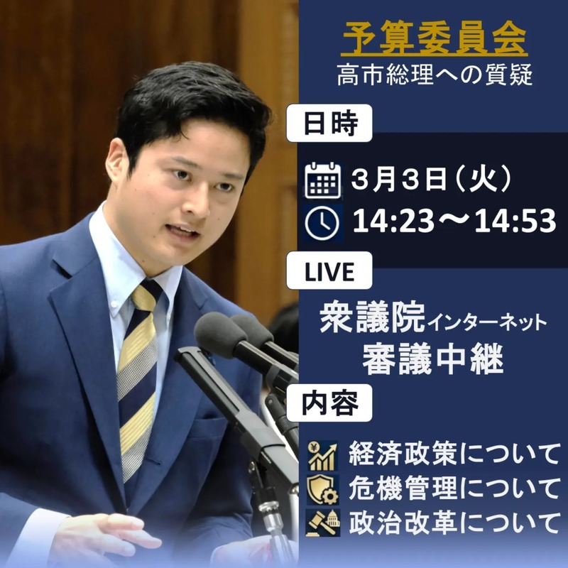 3月3日(火)14:23〜14:53、高市早苗内閣総理大臣に、衆議院予算委員会の場において、次の論点から質問します。