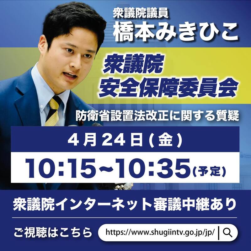 明日、4/24(金)【衆議院 安全保障委員会】橋本みきひこが質疑に立ちます