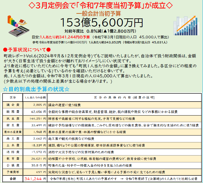 たとえば、以前の町政レポートでは、令和7年度一般会計当初予算153億5,600万円について、町民1人あたり約341,244円という形でお示ししました。
