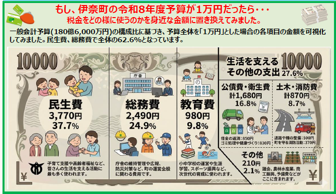 今回の町政レポートでは、一般会計予算180億6,000万円の構成比に基づき、予算全体を1万円とした場合の各項目の金額を可視化しました。