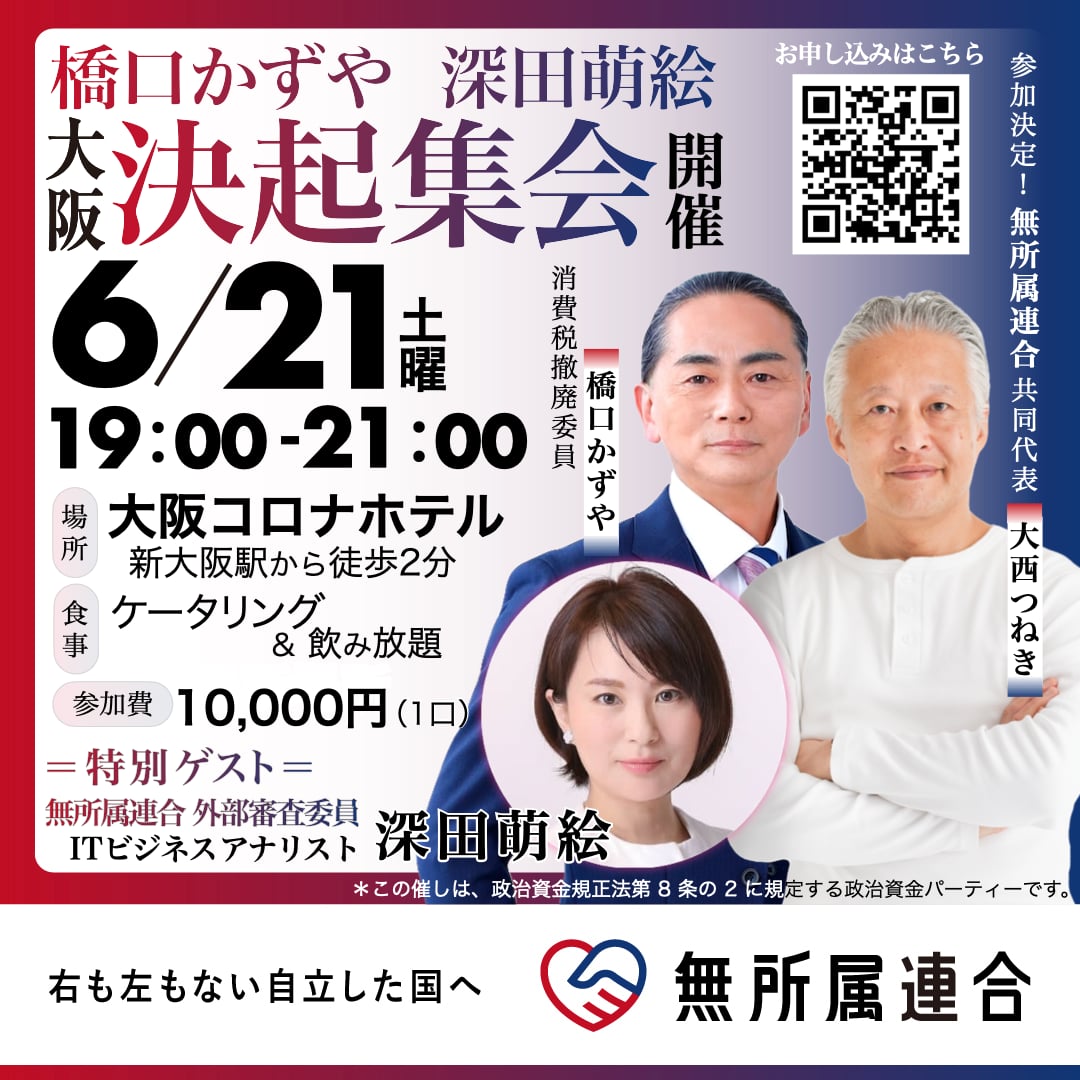 【告知】 無所属連合 大阪 決起集会 に 深田萌絵 (もえP)さんが来阪決定! ✨ 大西つねき 共同代表も参加決定✨ 「橋口かずや 深田萌絵 決起集会」開催! なんと!大阪のただのおっさん 橋口かずや が 決起集会を開催します! 恐れ多くも、深田萌絵 さんがスペシャルゲストで登場! 何が起きるかお楽しみに❤️ さらに! ✨大西つねき 共同代表 も参加いただけることになりました✨ ■ 概要 ■ 6月21日緊急!決起集会が決定しました。 「橋口かずや 深田萌絵 決起集会」はこの夏に行われる参議院選挙の選挙資金を支援者の皆様に、ご協力をお願いするための政治資金パーティーとなります。 日時:2025年6月21日土曜日 19時〜21時 場所:大阪コロナホテル 住所:大阪府大阪市東淀川区西淡路1丁目3番21号 食事:ケータリング&飲み放題 参加費:10,000円(一口) 【主催者】 橋口かずや (無所属連合 消費税改革委員) 【登壇者】 大西つねき (無所属連合 共同代表) 【特別ゲスト】 深田萌絵 (ITビジネスアナリスト YouTube番組プロデューサー) *この催しは、政治資金規正法第 8 条の 2 に規定する政治資金パーティーです。 ※決済手数料は、ご購入さまのご負担となります。 あらかじめご了承をお願い申し上げます。 お申し込みはこちら(政治団体 ありがとう 公式ホームページ) https://arigatou.jp.net/ 当日は、寄付スペースを設けます。 以下のURLより事前にご寄付をお振込いただくことも可能です。 ※ 橋口かずや 率いる 政治団体 ありがとう ※ ■政治団体 ありがとう 寄付ページ(橋口かずや 政治及び選挙の活動に使用されます。) https://docs.google.com/forms/d/e/1FA... ※当団体(政治団体 ありがとう)は明瞭会計を心がけ通帳開示しております。 https://arigatou.jp.net/ 公式サイトのトップページ「党資金報告書」からご確認いただけます。 (随時更新しております 反映までお待ちください。) みなさまの温かなご支援賜りますと幸いです。 ーー 【無所属連合情報】 ■無所属連合 公式ホームページ https://mushozoku.jp/ ■無所属連合 街宣告知アカウント X(旧Twitter) https://x.com/utsumin_gaisen みんなで盛り上げていきましょう! ■無所属連合 寄付ページ https://mushozoku.jp/donations/ #無所属連合 #大西つねき #橋口かずや #深田萌絵 #深田もえ
