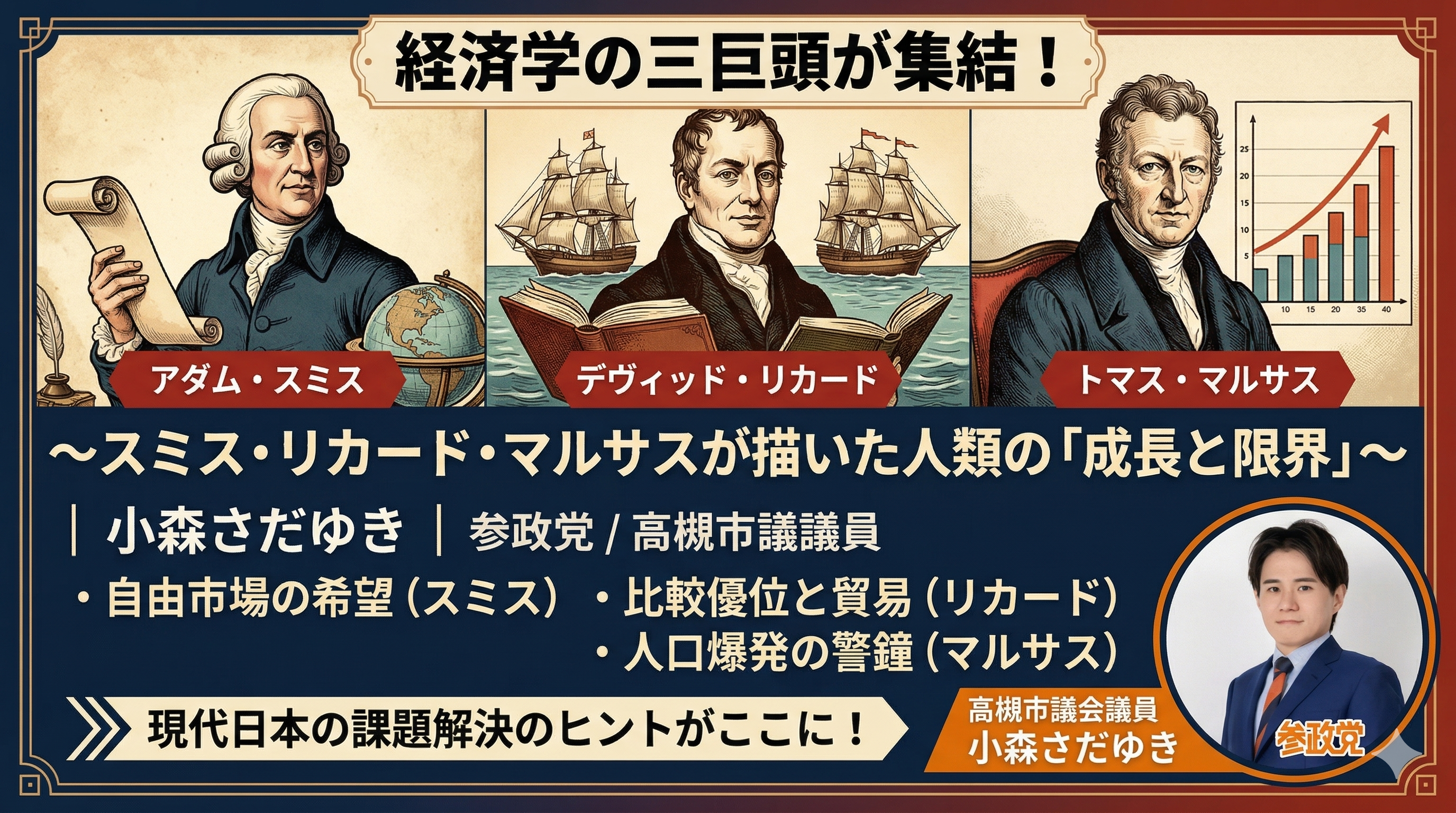 自由な競争(スミス)を尊び、国際的な連携(リカード)を模索しながらも、資源や人口の物理的な限界(マルサス)を見据えること。この三つの視点のバランスこそが、今、日本の政治に求められている「地に足のついた経済政策」ではないでしょうか。