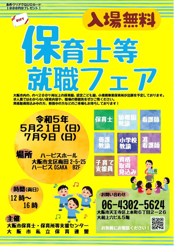 今回は、令和5年7月9日(日)にハービスホールで行われる「保育士等就職フェア」の紹介です!