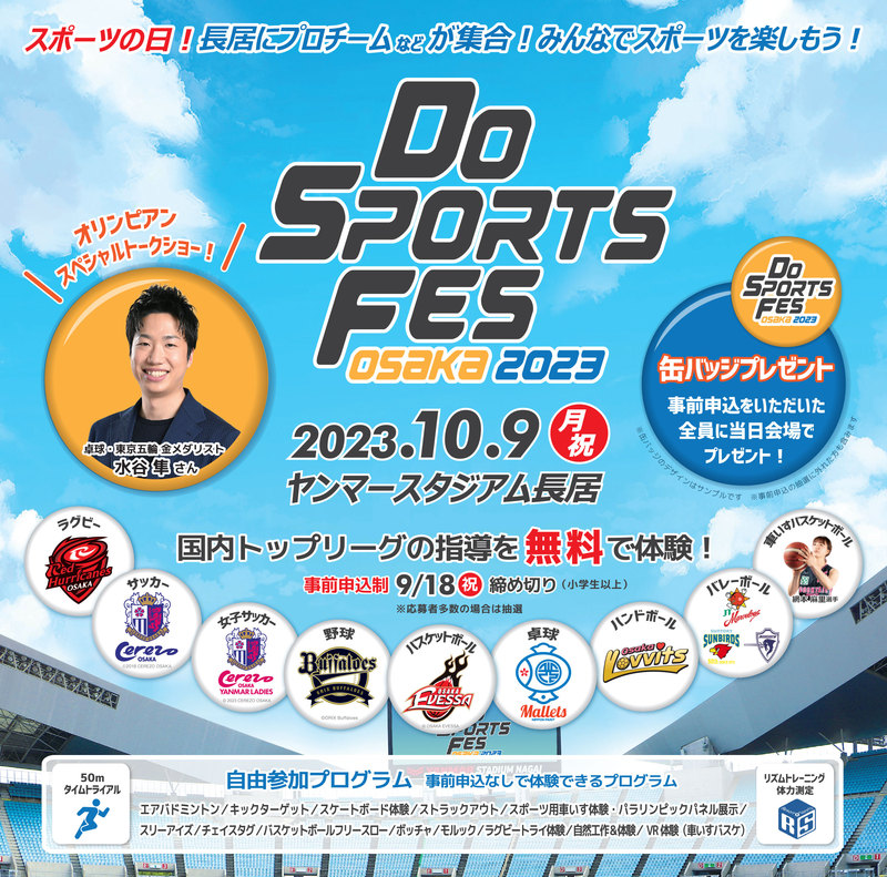今回は、令和5年10月9日(月)にヤンマースタジアム長居、ヨドコウ桜スタジアム北練習室・南練習室で行われる「Do Sports Fes OSAKA 2023」の紹介です!