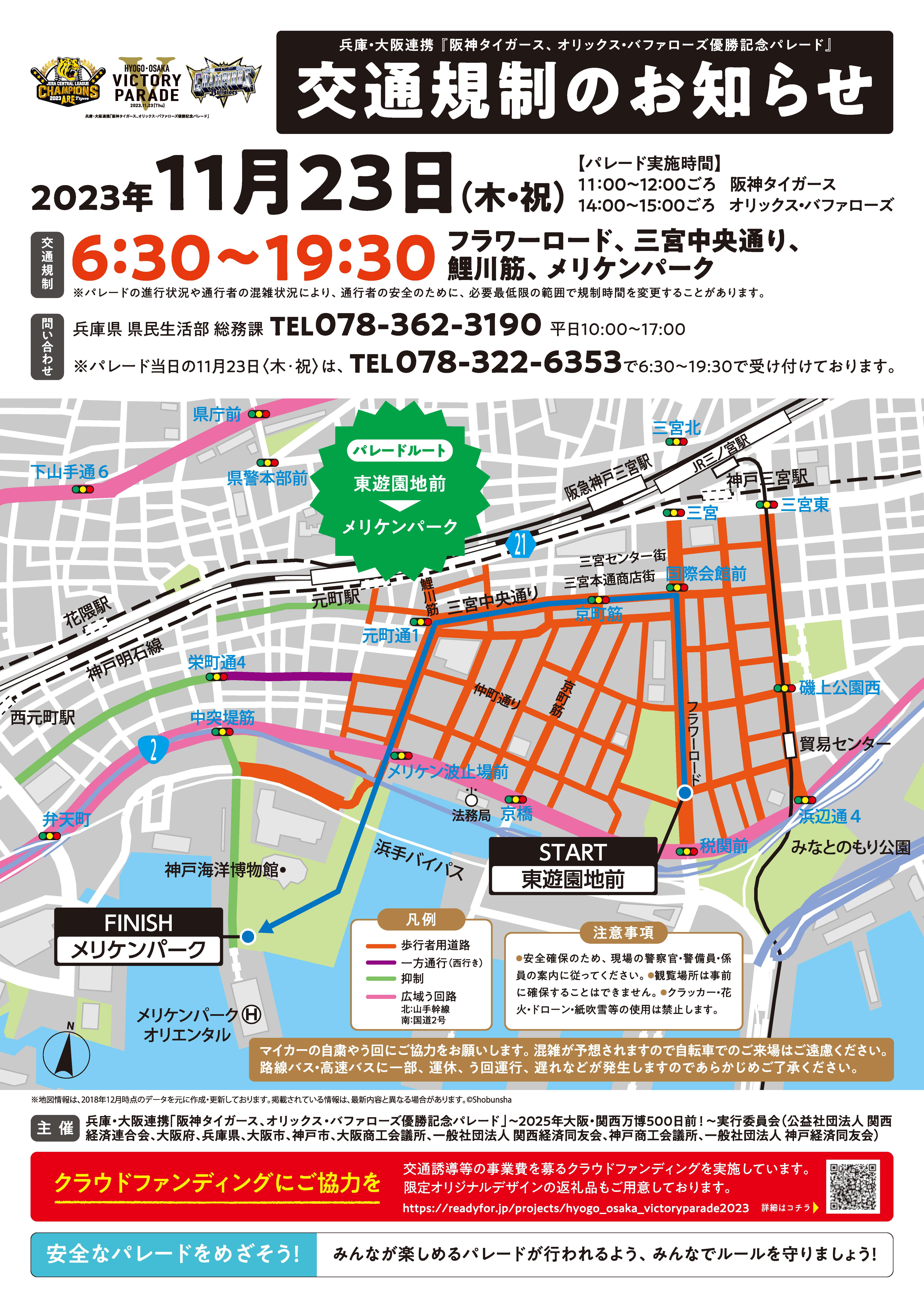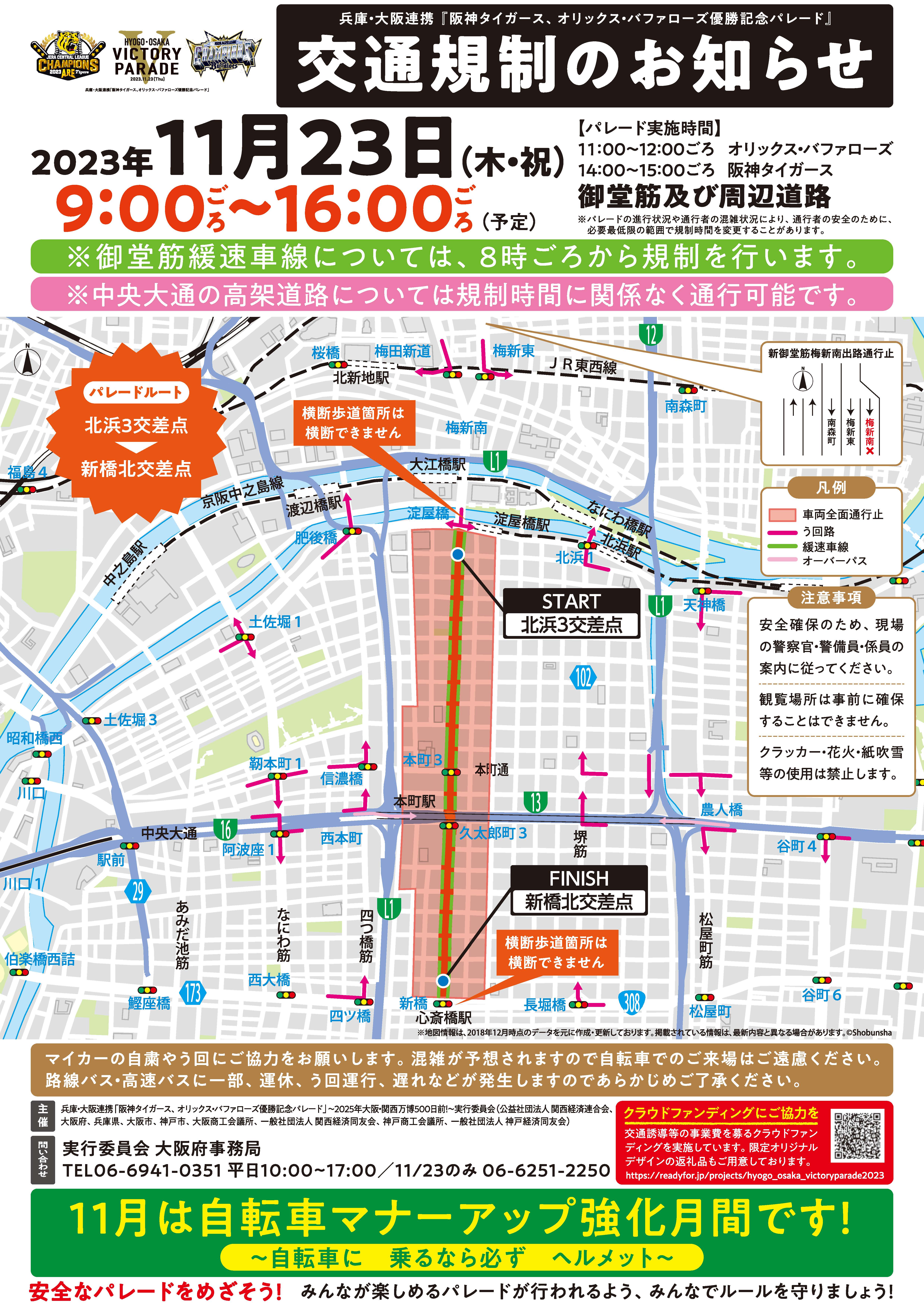 両チームの優勝記念パレードが御堂筋と三宮周辺で行われます!今回、交通規制の内容が発表されたのでお知らせします☆