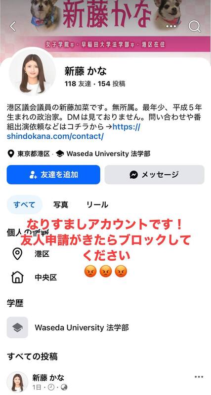 ホーム>政党・政治家>新藤 加菜 (シンドウ カナ)>【なりすましにご注意ください】現在、Facebook上で私を装った偽アカウントの存在が確認され...