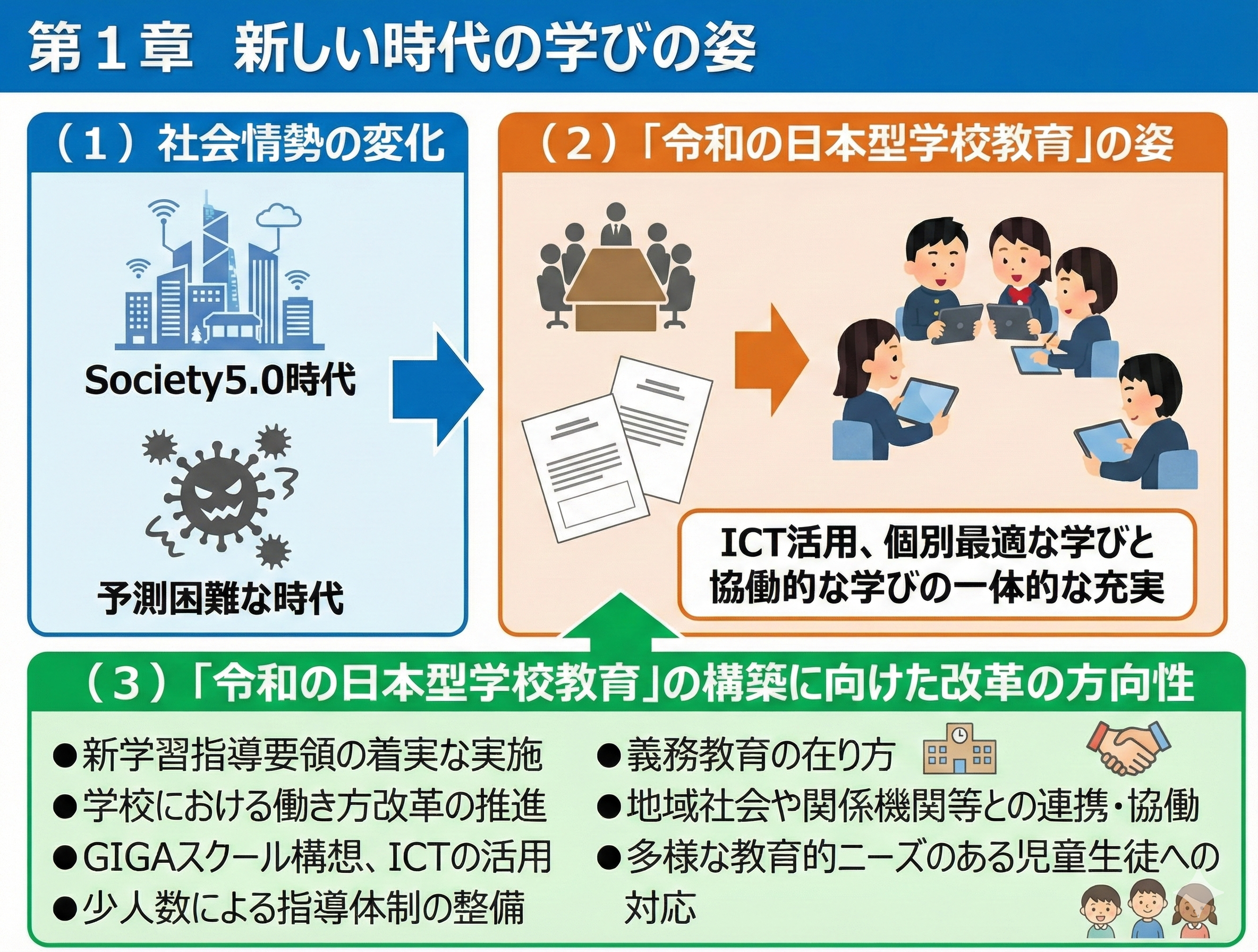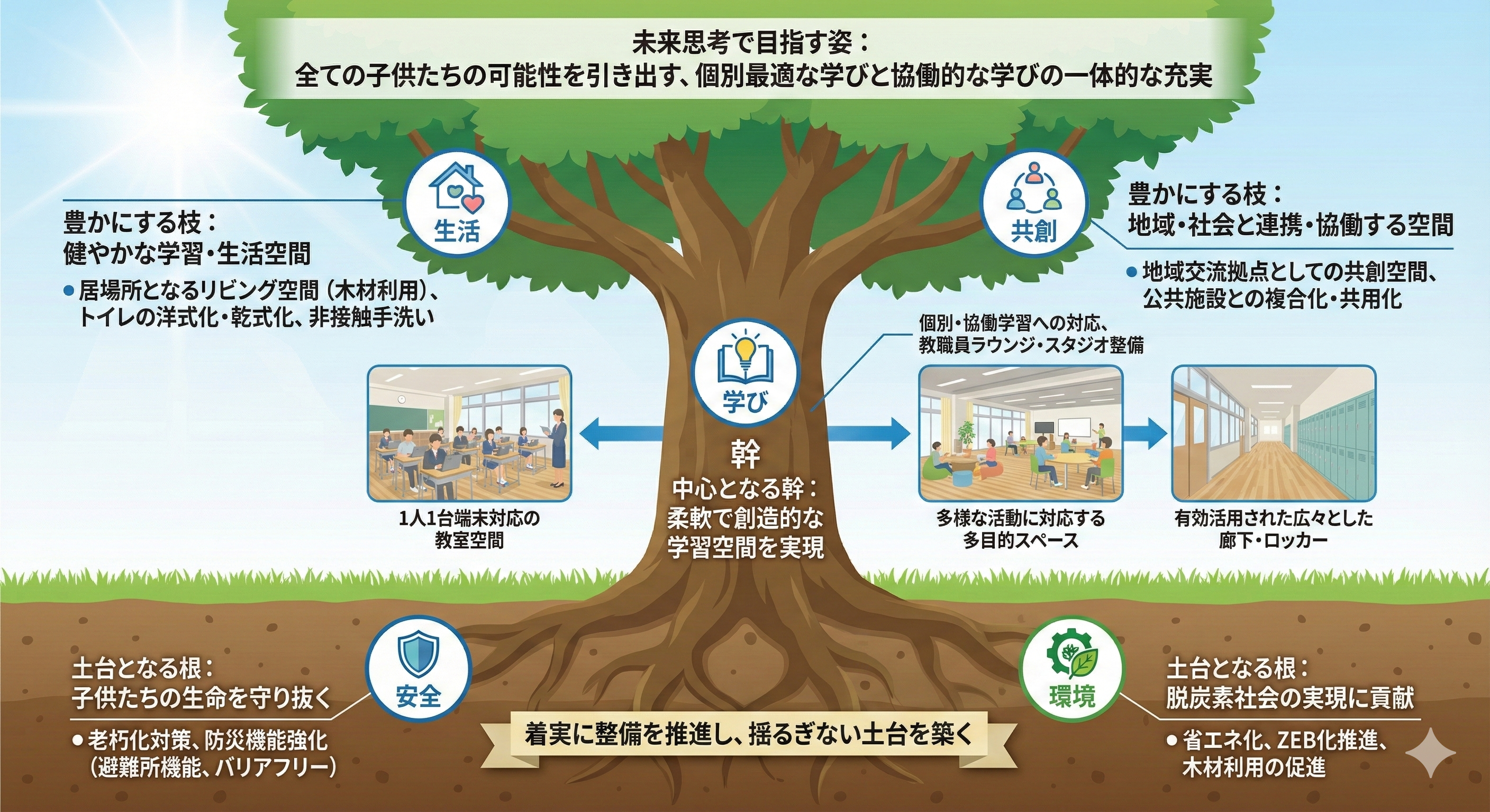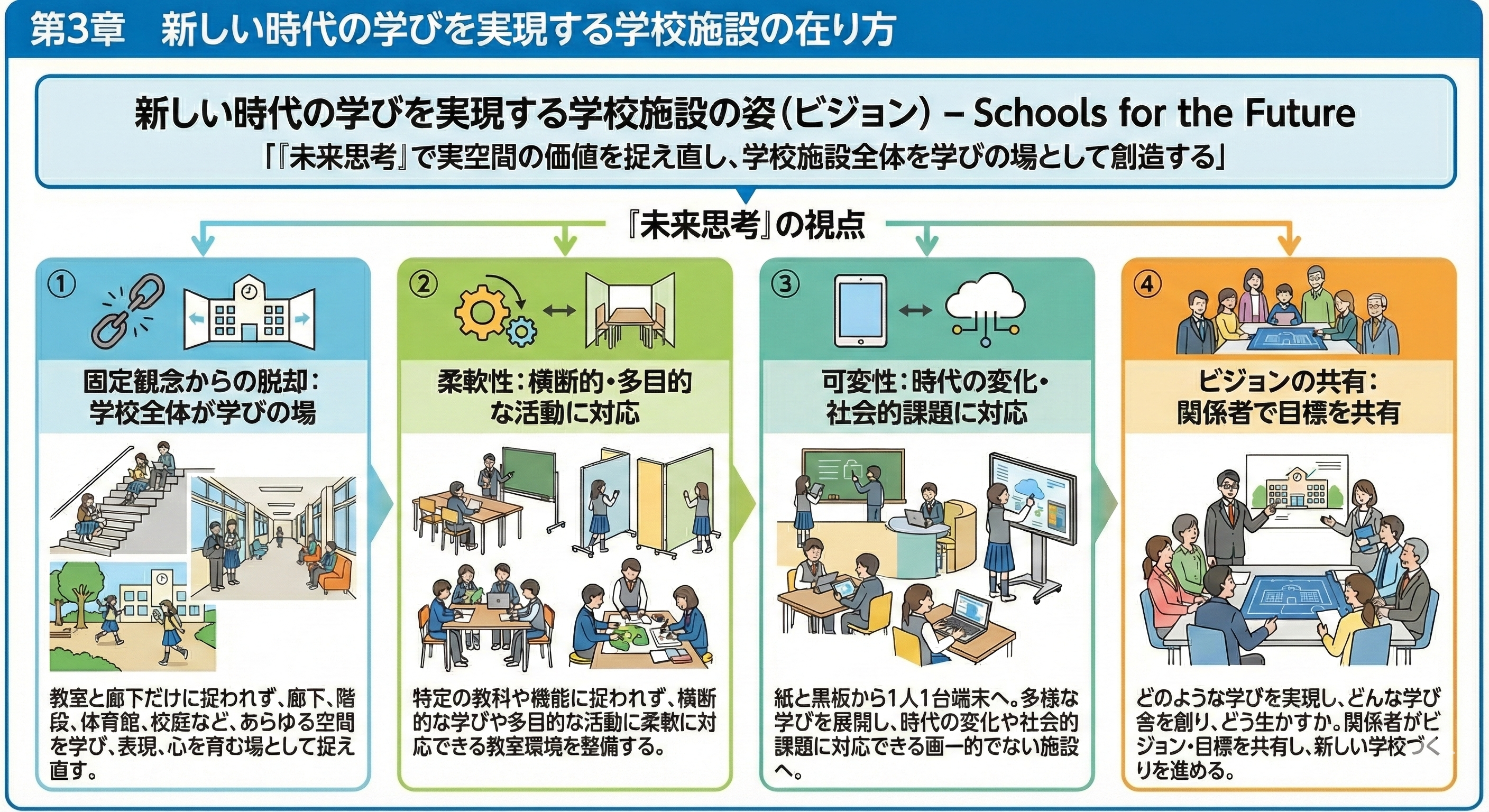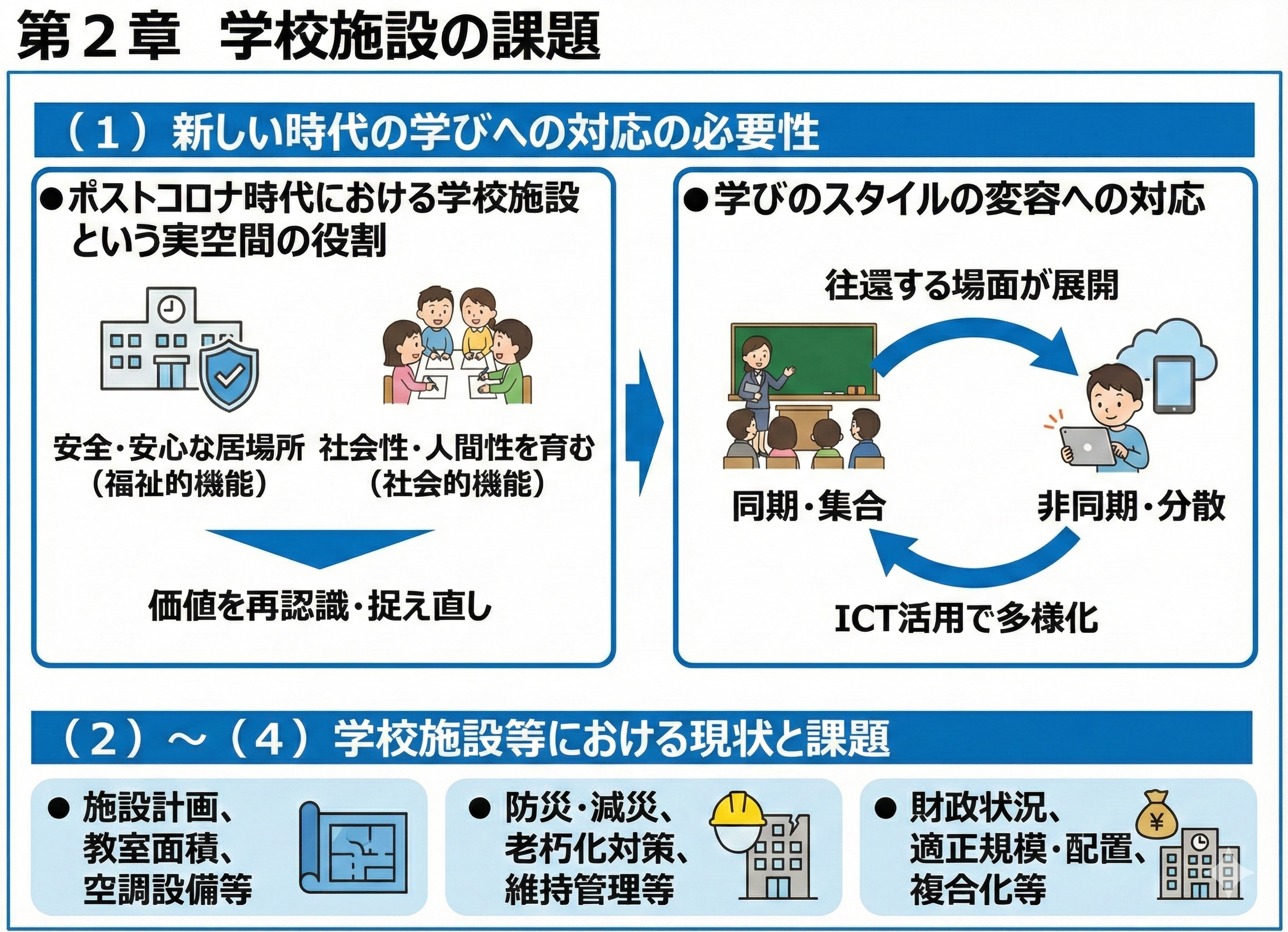 これ以降は文部科学省の「新しい時代の学びを実現する学校施設の在り方について」最終報告 概要 という資料をもとに、AIを用いて作成した図解でご紹介します。