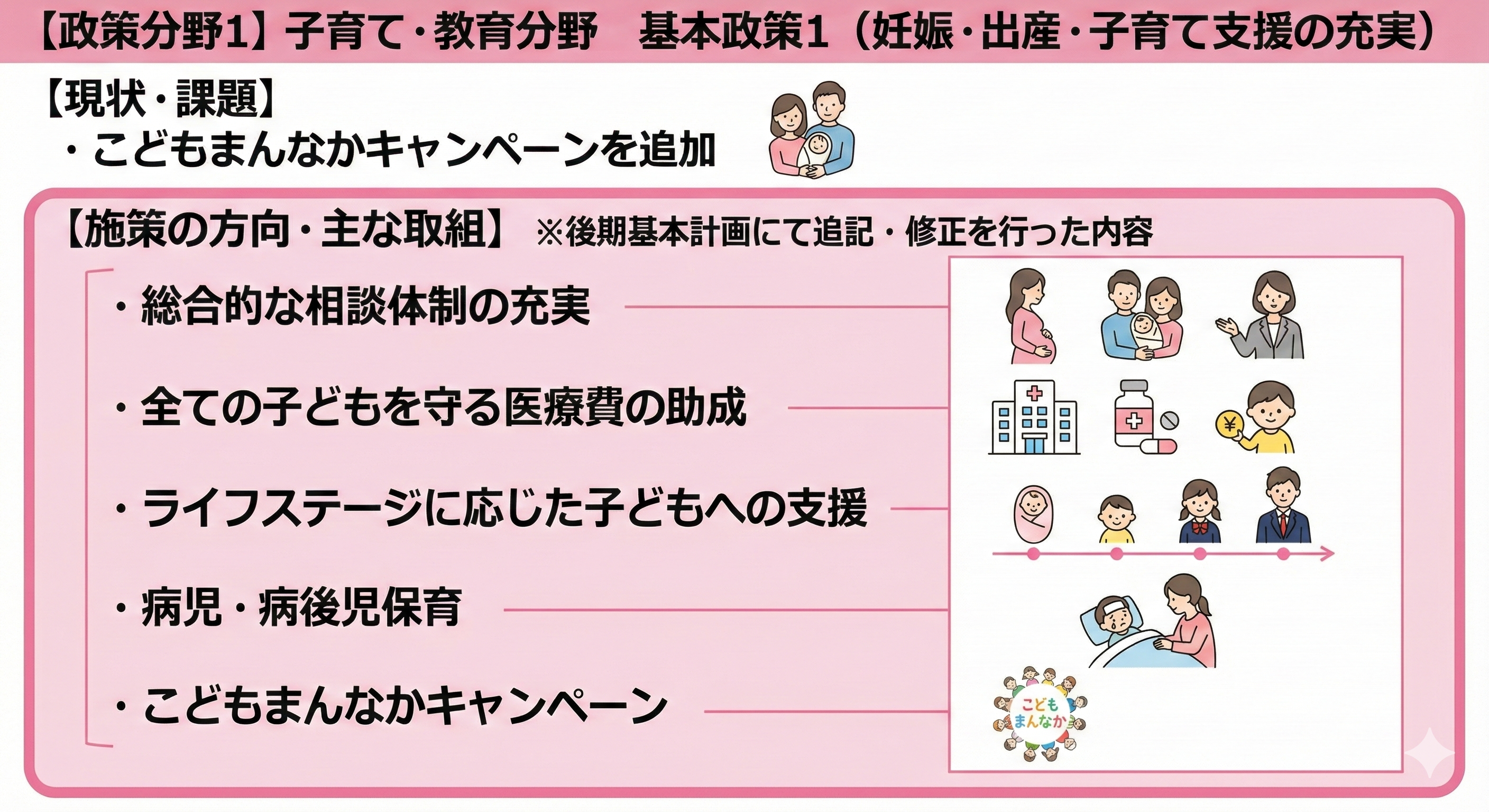 今回のテーマは、多くの子育て世代が一番気になる「子育て・教育」分野について! 資料をもとに、重要ポイントを画像で分かりやすくまとめました。