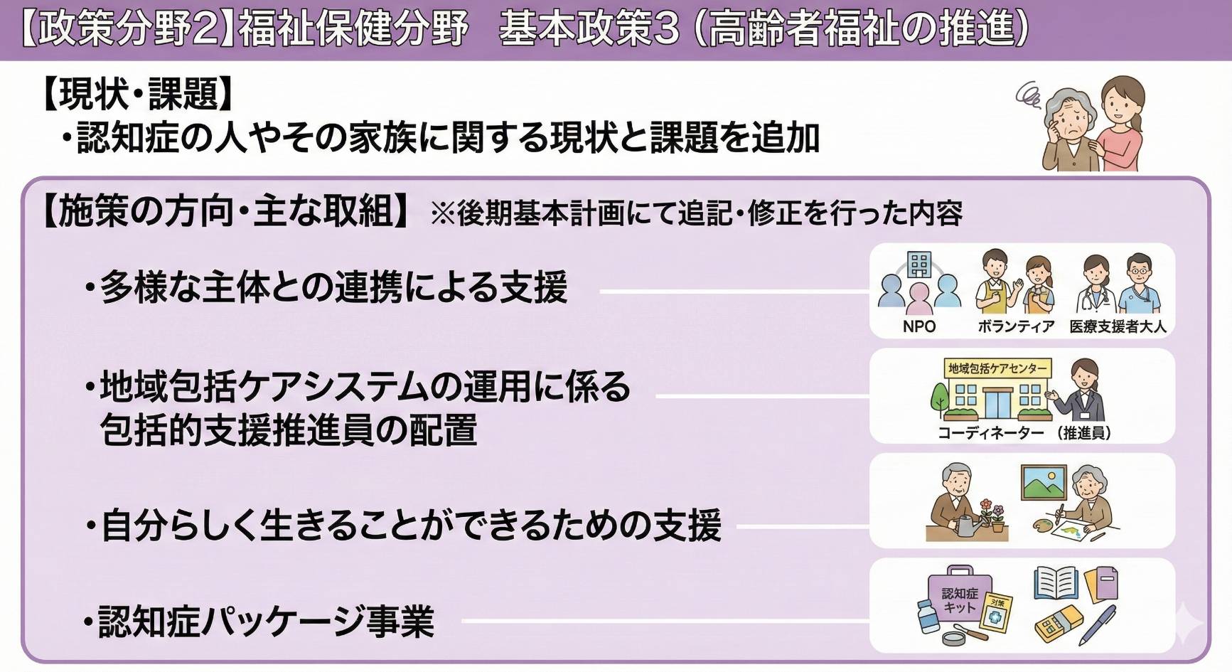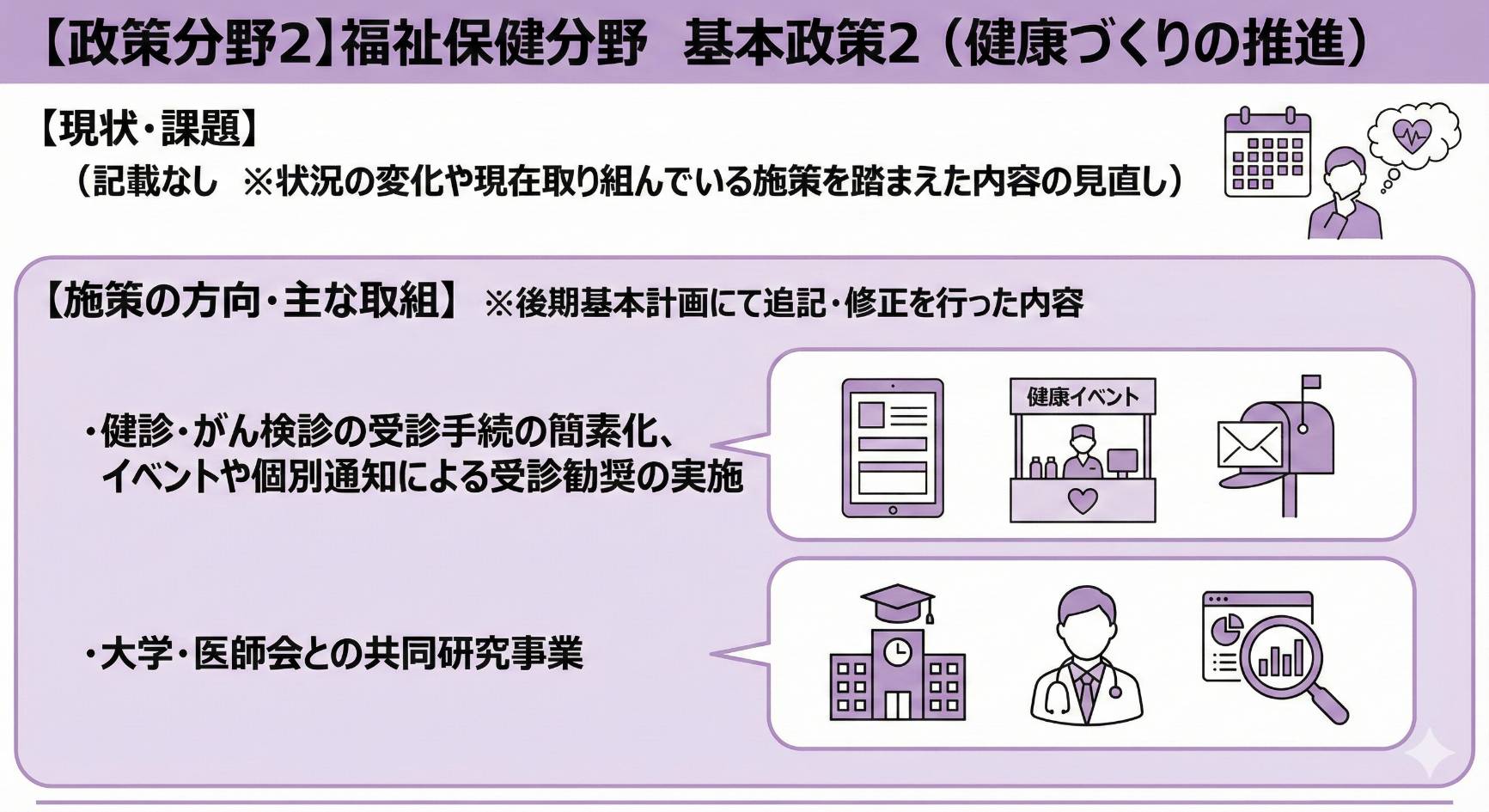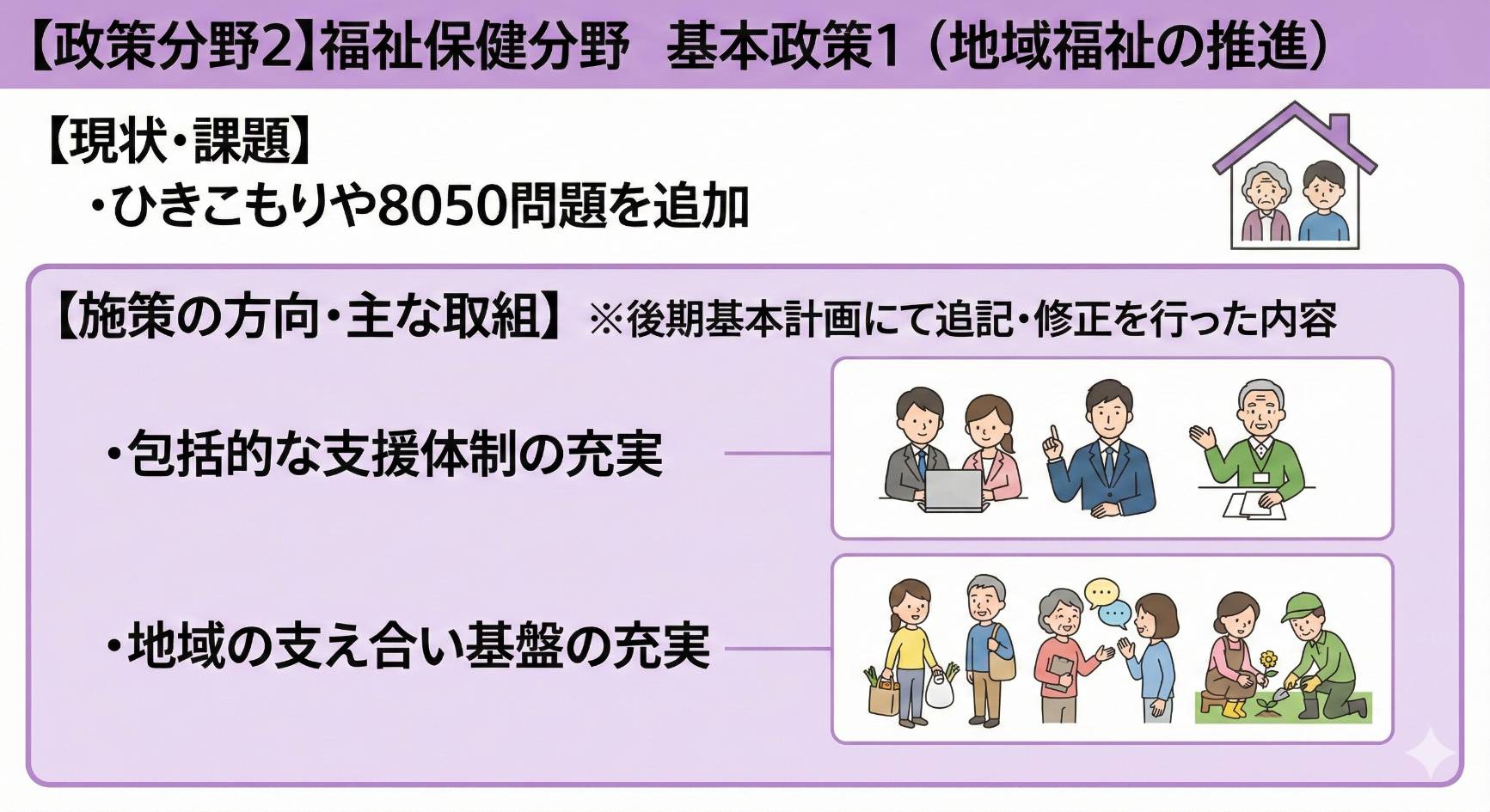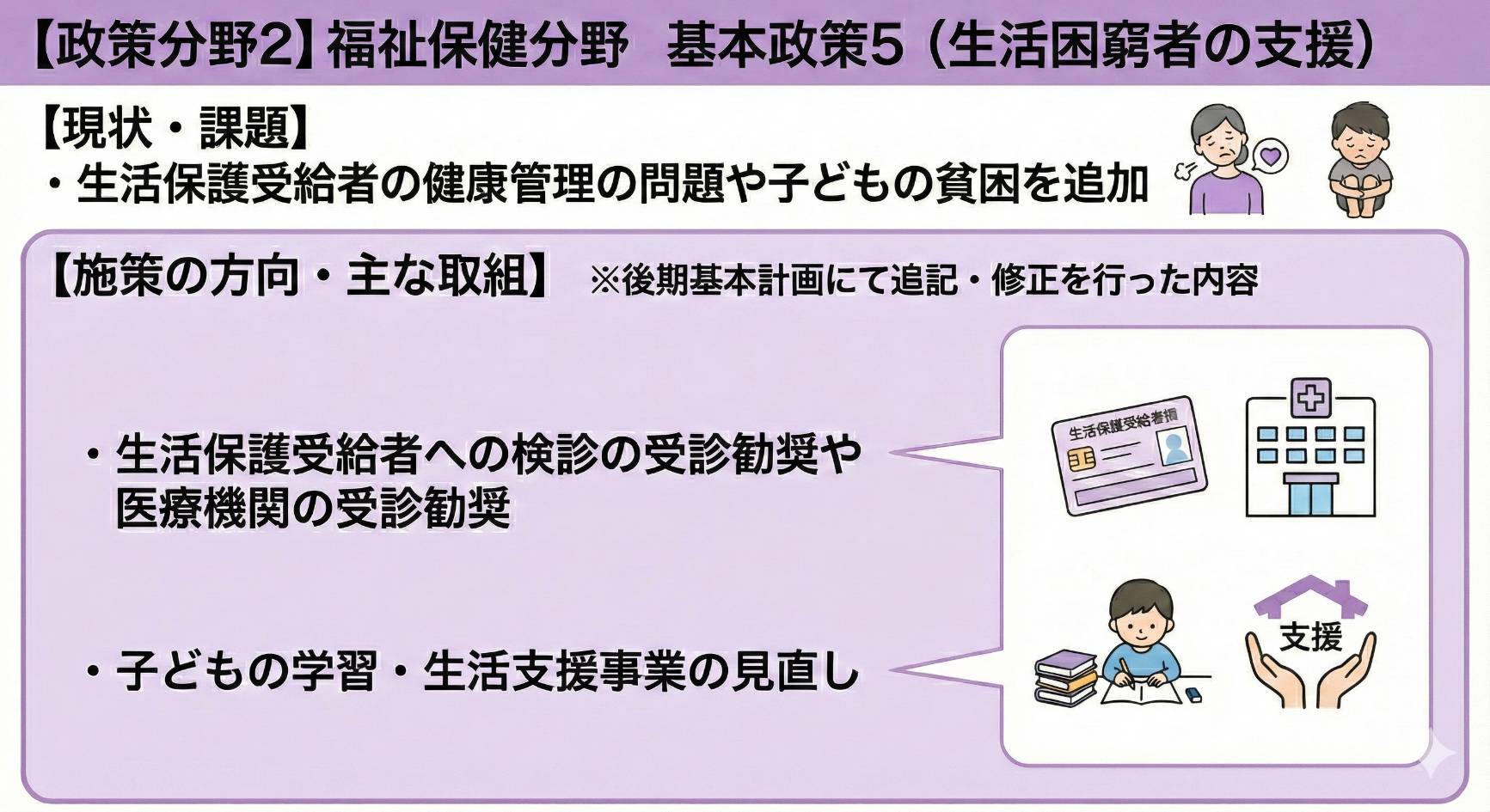今回のテーマは、福祉保健分野です。議会で報告された資料をもとに、重要ポイントを画像で分かりやすくまとめました。