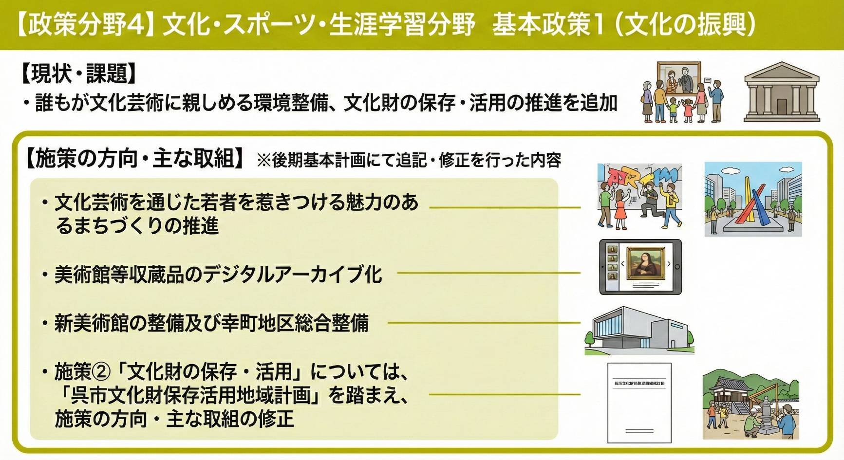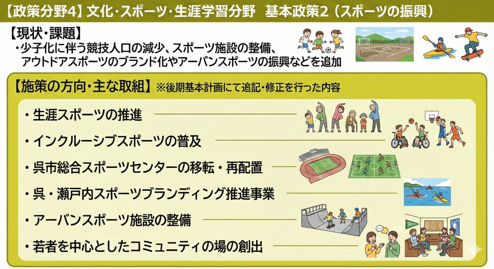 今回のテーマは、文化・スポーツ・生涯学習分野です。呉市議会で報告された資料をもとに、重要ポイントを画像で分かりやすくまとめました。
