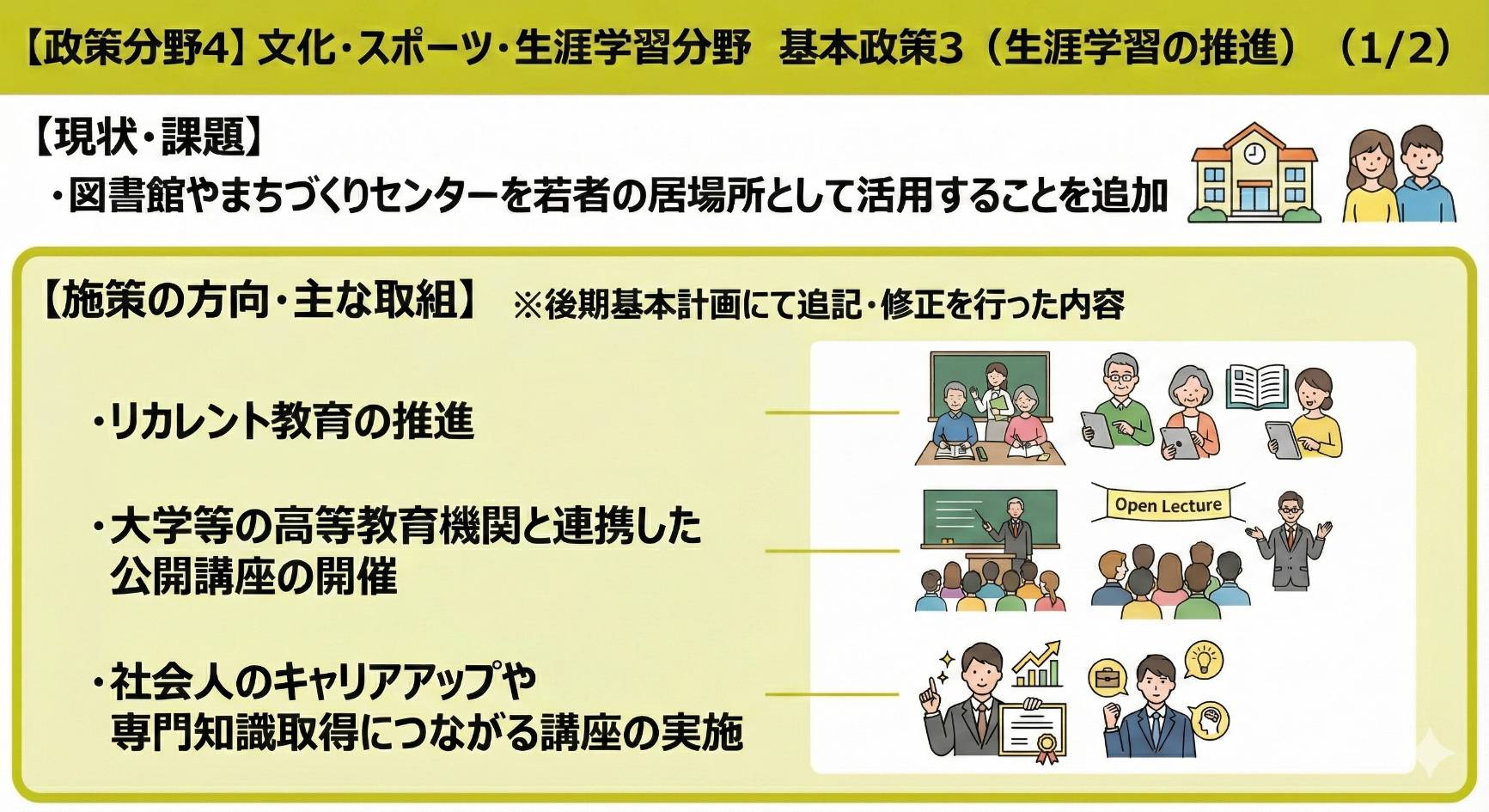 図書館については,子どもや若者など,幅広く市民に利用してもらえる魅力的な施設となり,市民のにぎわいと交流を生む場所となるよう,環境の整備や機能の充実に取り組みます。※リカレント教育:リカレント(recurrent)とは,繰り返す,循環するの意。学校教育を終えた社会人が,自分の仕事に関する専門的な知識やスキルを学ぶことで,「社会人の学び直し」とも呼ばれる