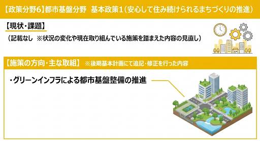公共交通や公共空間、上下水道などの項目は全体的に変化がみられます。都市基盤分野は暮らしの基盤となるものであり、中長期的なものです。引き続き関連する個別計画の動向を見ながら、取り組んでまいりたいと思います。ちなみに、住環境と公園に関しては令和7年12月定例会において一般質問を行う予定です。