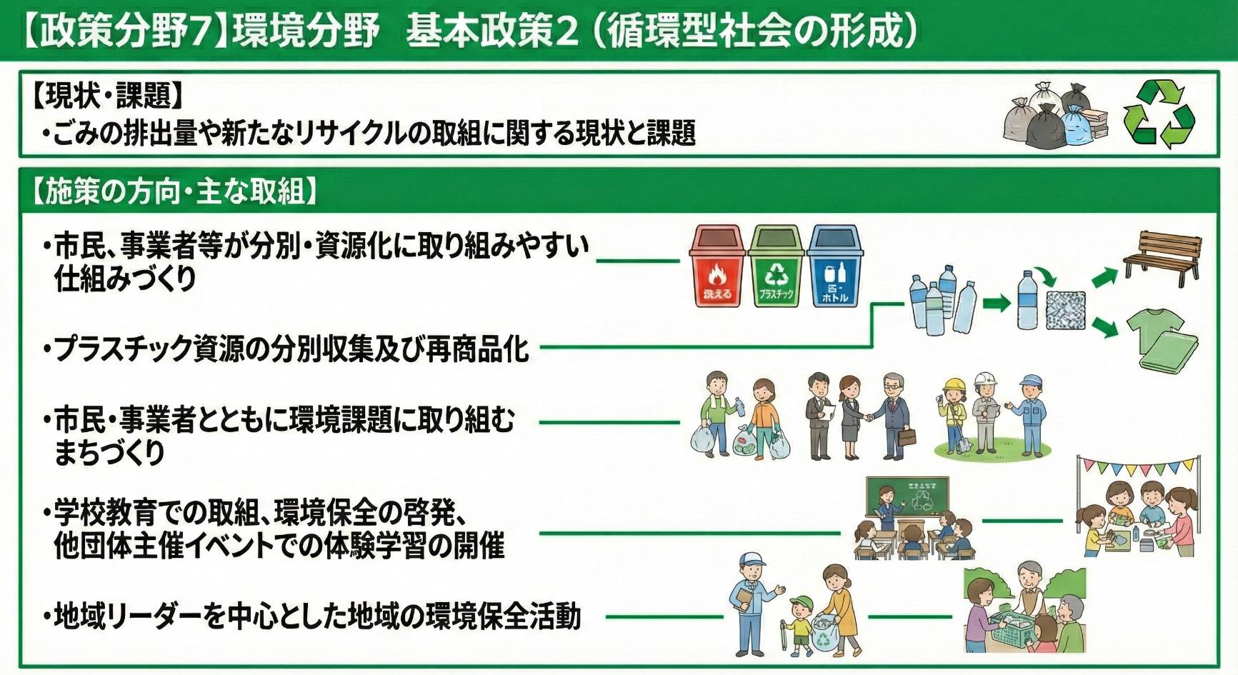 リサイクル意識の向上促進,食品ロス削減の啓発,プラスチック資源の分別収集及び再商品化など