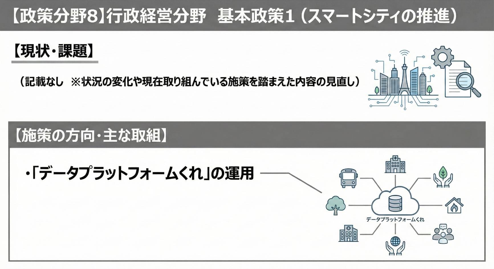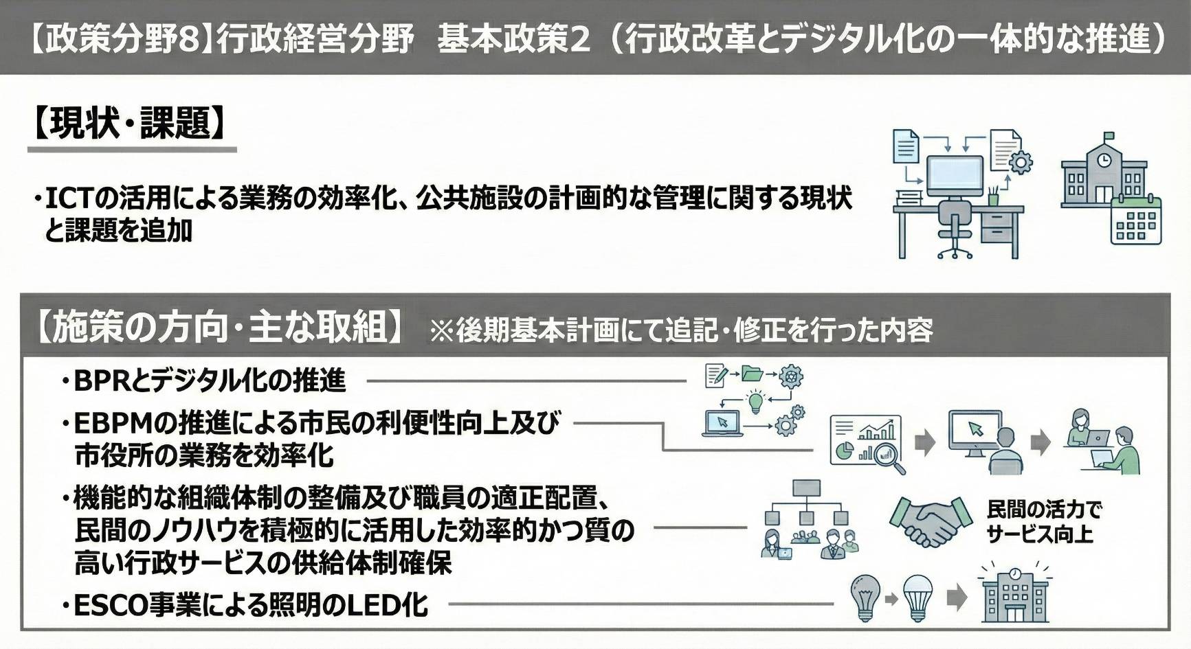 前期5年の社会情勢の変化が著しく、この行政経営分野も大きな変化がみられます。特に「官民連携によるスマートシティの推進」、「市民ニーズに対応した行政サービスの提供と効率的な行政システムの確立」などは今後の具体化が気になります。また私が求めた公共施設の戦略的再編にかかわる視点も反映されている印象です。