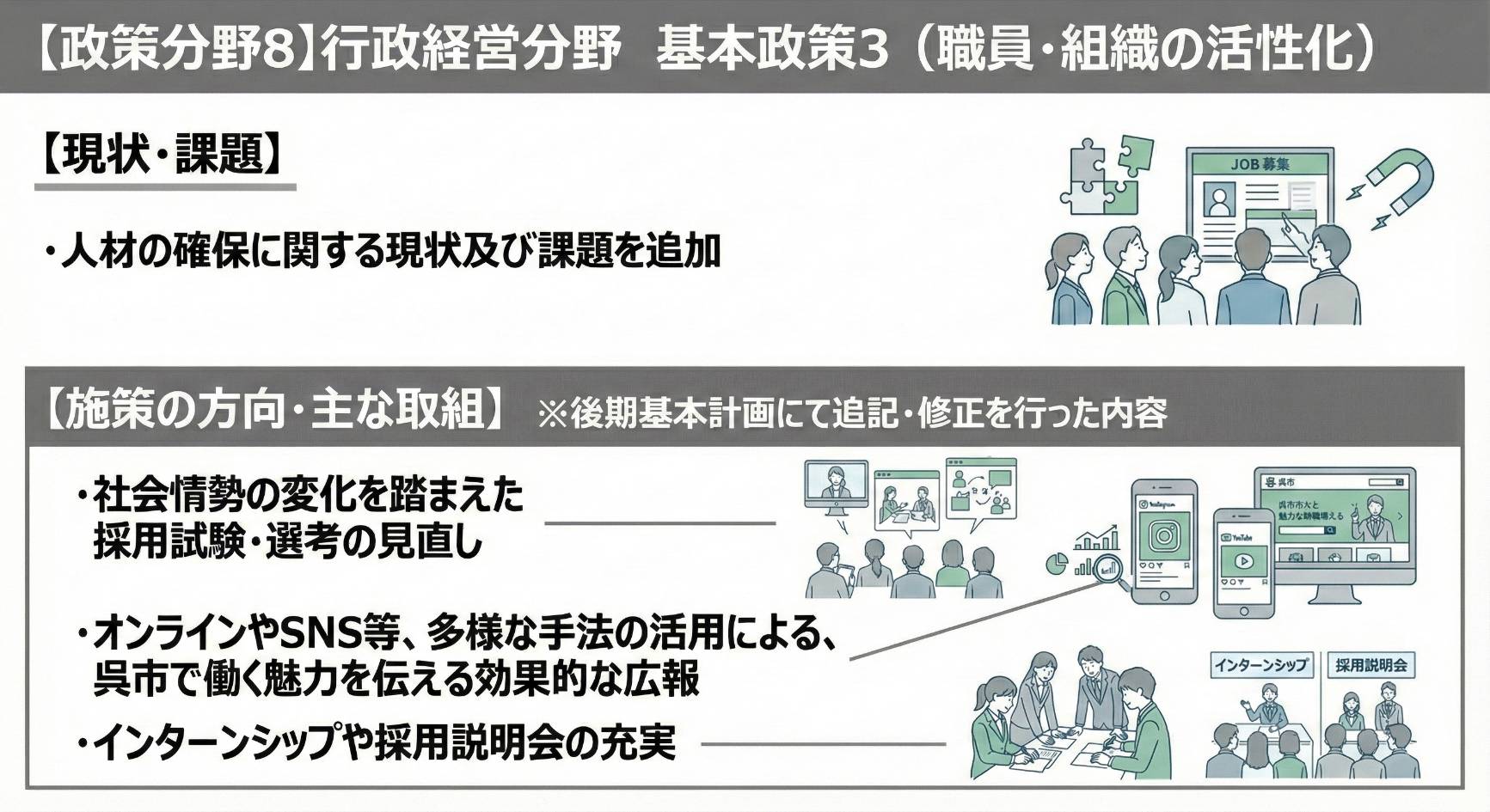 今回のテーマは、行政経営分野です。呉市議会において報告された資料をもとに、重要ポイントを画像で分かりやすくまとめました。