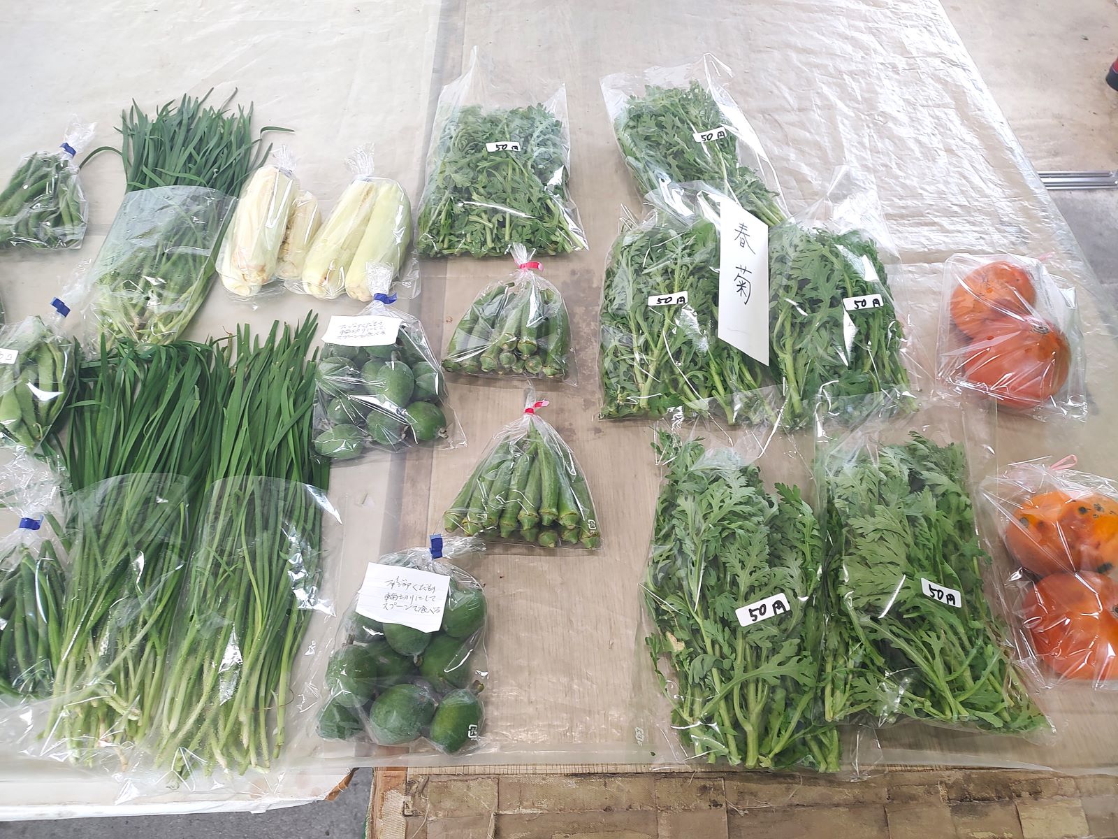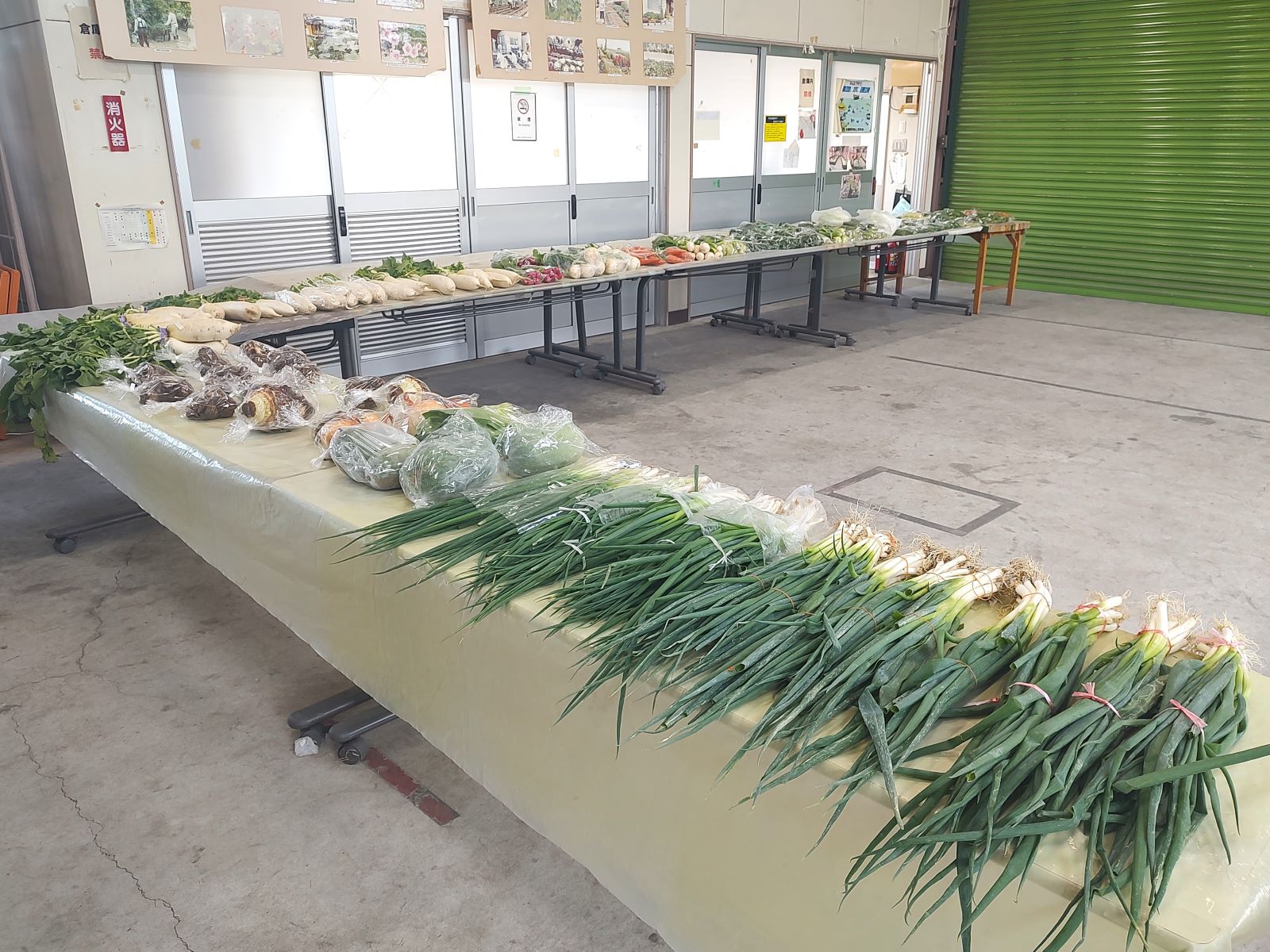 今朝のふれあい朝市は、土日に開催された豊年感謝祭への野菜出品のあとでもあり、並ぶ野菜は少なめ予想していましたが、今年度で一番の出品数。久々にL字形にテーブルが配置されて野菜が並びました。