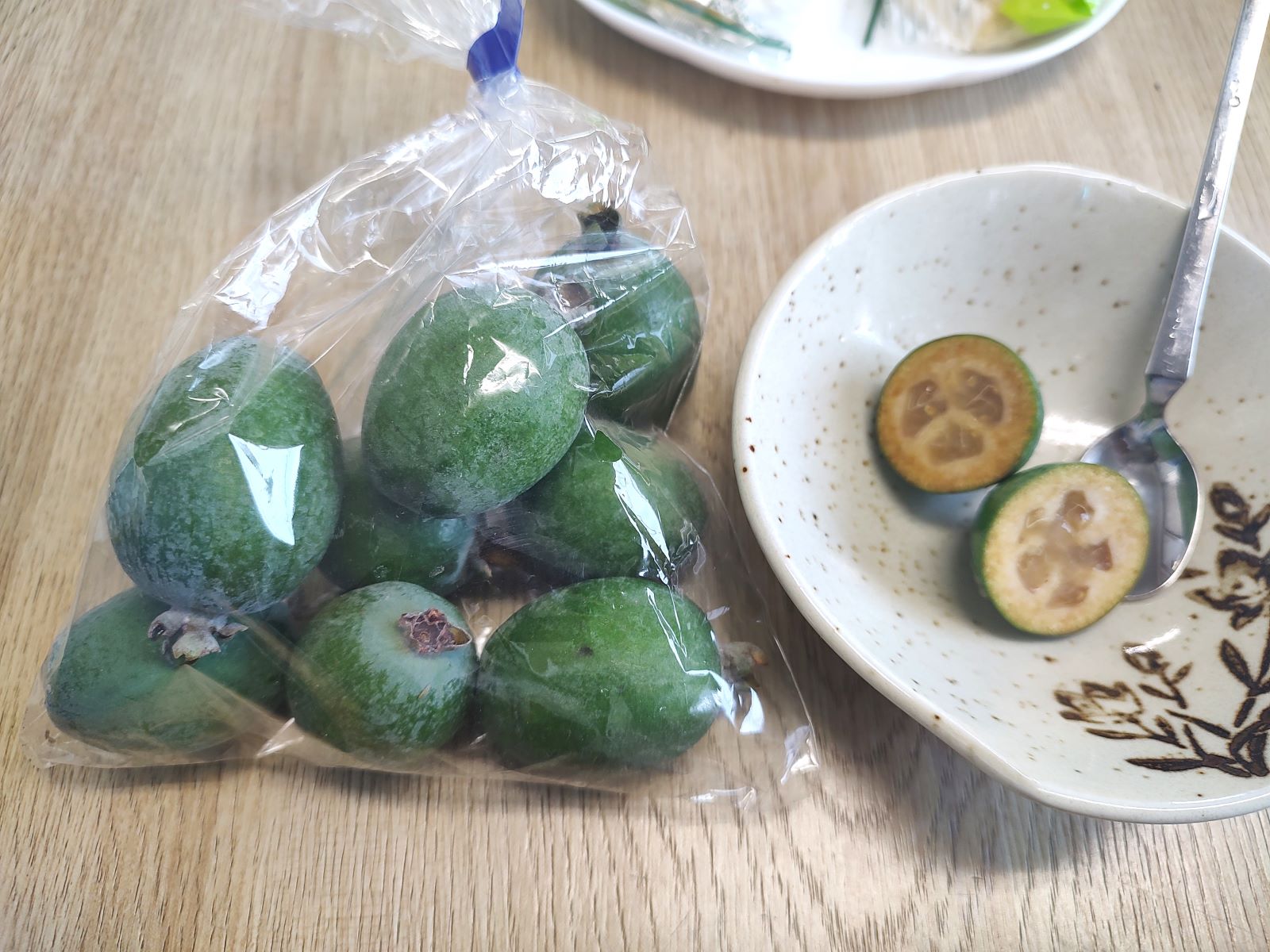 秋野菜が出始めて、色合いもにぎやかです。スタッフのお母さま方に「珍しい果物があるから、食べてみて」と、見た目は緑色のビワのような果物をいただきました。これは『フェイジョア』という名前で、グァバと近縁種だそうで、和名では「パイナップルグァバ」と呼ばれるそうです。味は梨にやや柑橘系が入り、触感はキウイのようで、とにかく不思議な初体験の味でした。