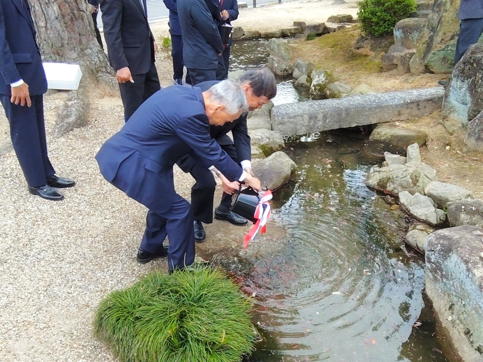 昨年の天候は雨でしたが、今年は天候に恵まれました。ご来賓・町内関係者による玉串奉典ののち、明治用水から農水を引いた池へ、喜平翁のご子孫さまと明治用水土地改良区の石川理事長の手によって、金魚の放流が行われました。