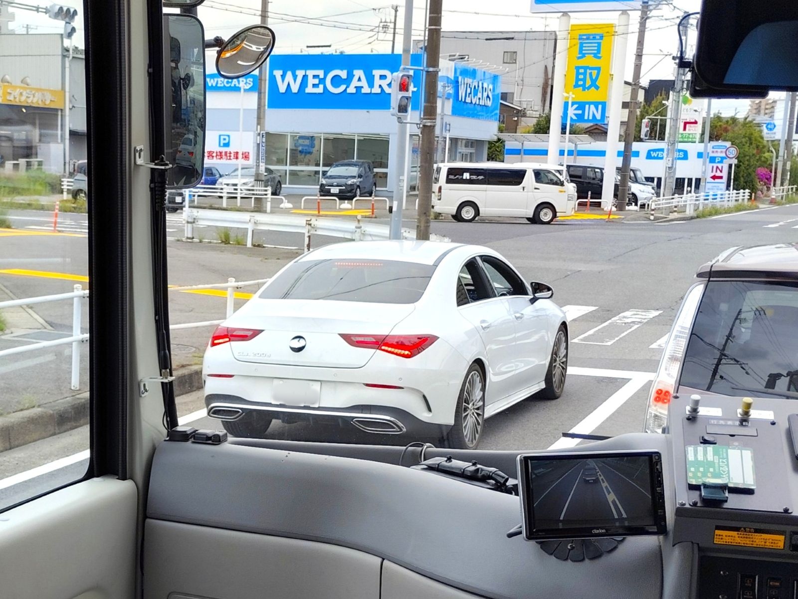 目的地に着いた後は、皆さんで昼食をとり、有名なパン屋さんで買い物をして帰路につきました。帰りの便もけっこう混み合い、約10分遅れの到着でした。途中、信号待ちのバスの中からふと横の車両を見ると、エンブレムの蓋が半開きでしたが、故障か何かでしょうか。